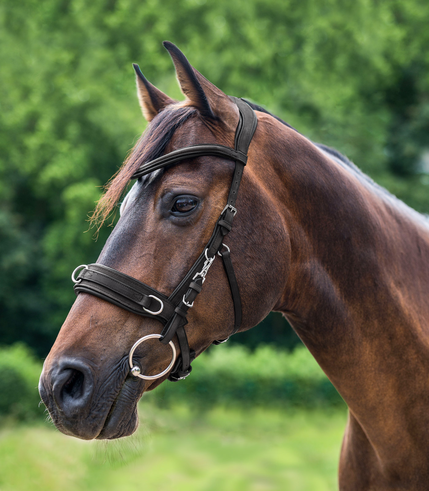 The anatomical cut provides much greater freedom for the ears and also the cheekbone. Very softly padded. In high quality leather, with stainless steel fittings. Can be used with, and without, a bit.