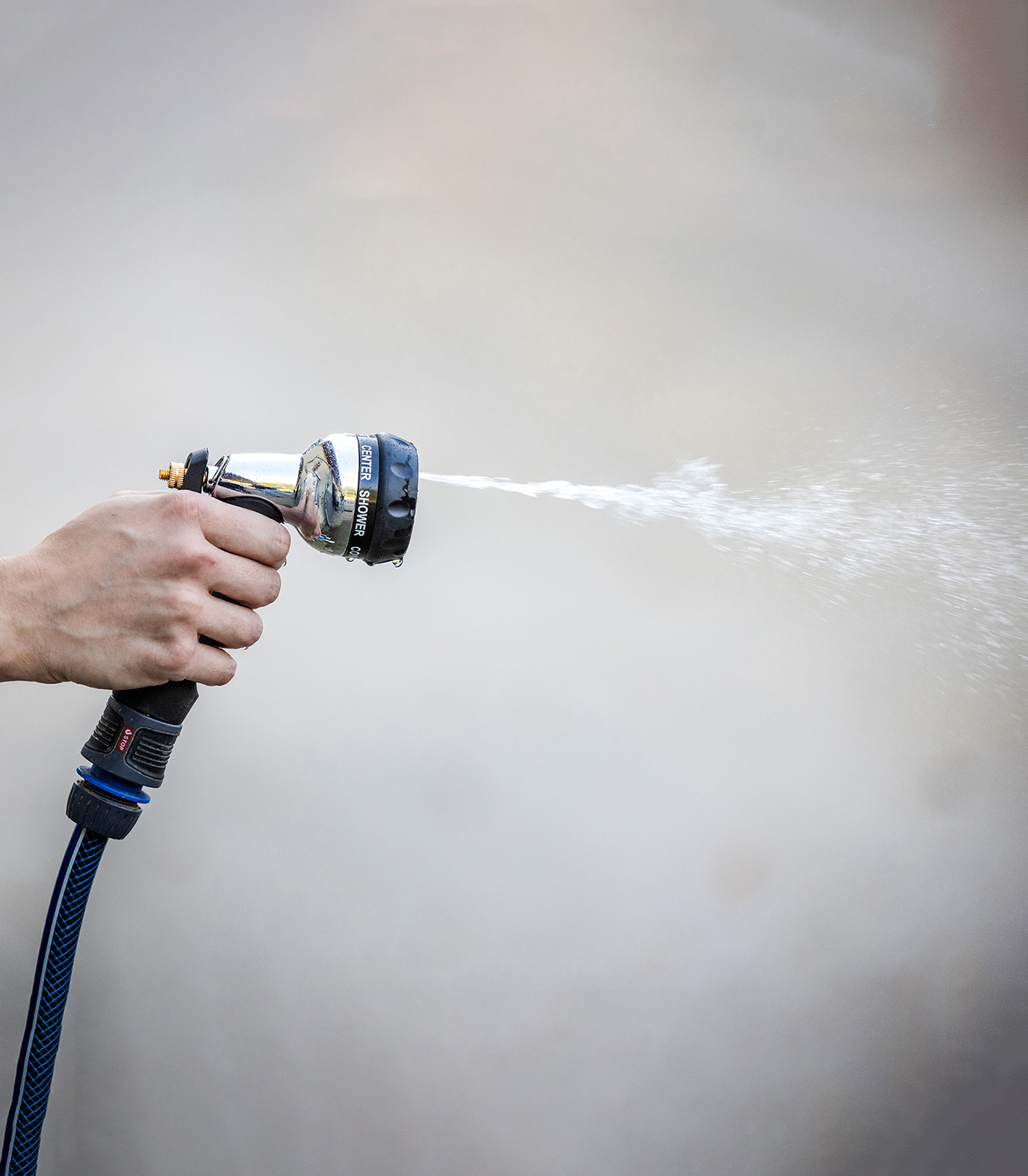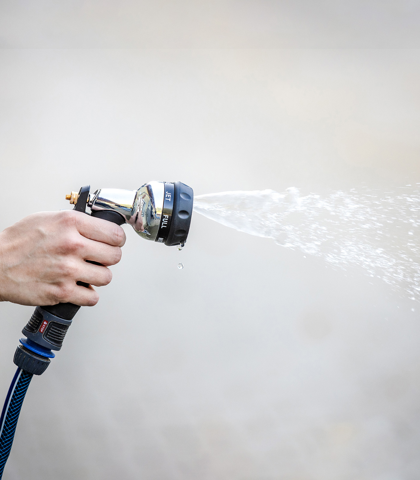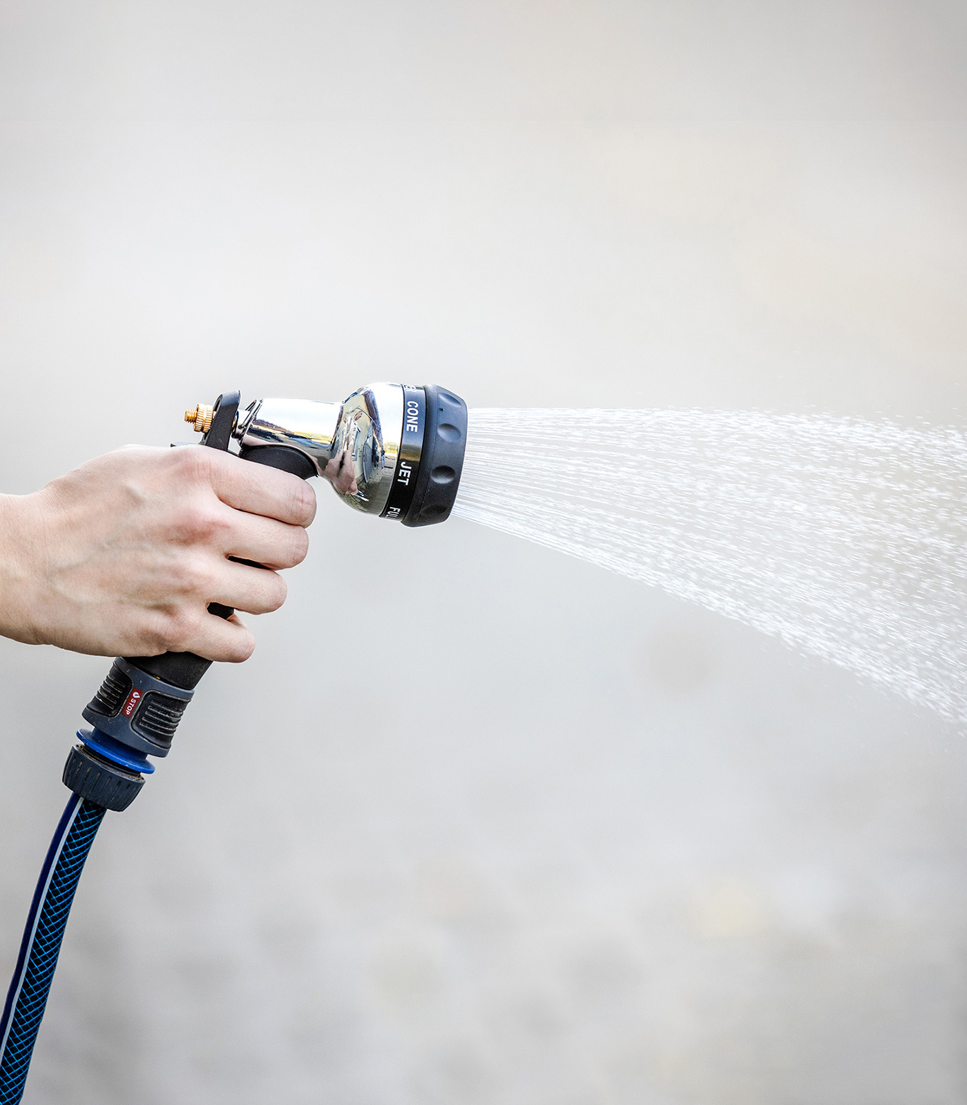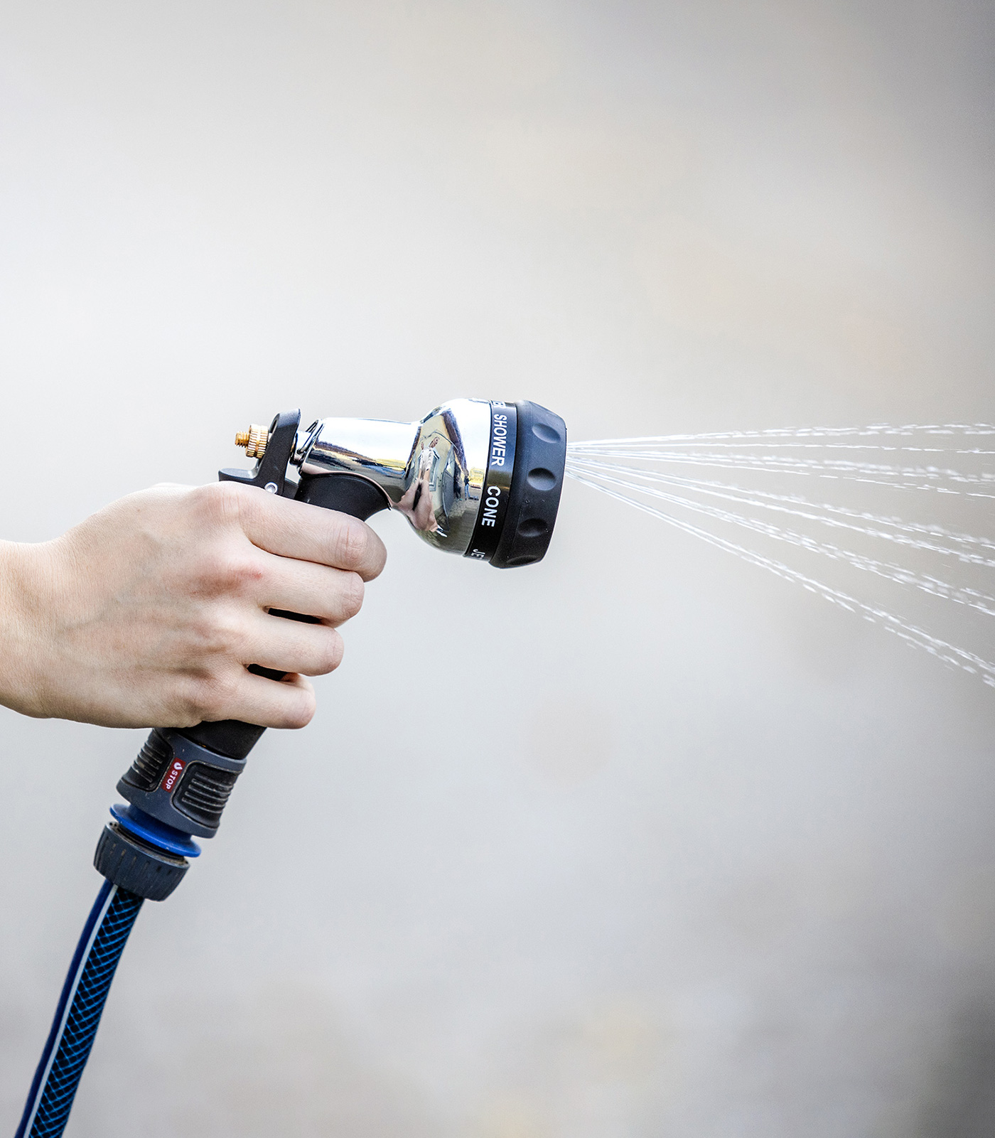 Robust shower head made of high-quality plastic with 7 spray settings, from wide to narrow spraying range, strong to soft jets, the brass multifunctional shower head is perfect for every use in the stable and when travelling. Infinitely variable dosage of water delivery and permanent lock for continuous spraying. Easy to operate with one hand.