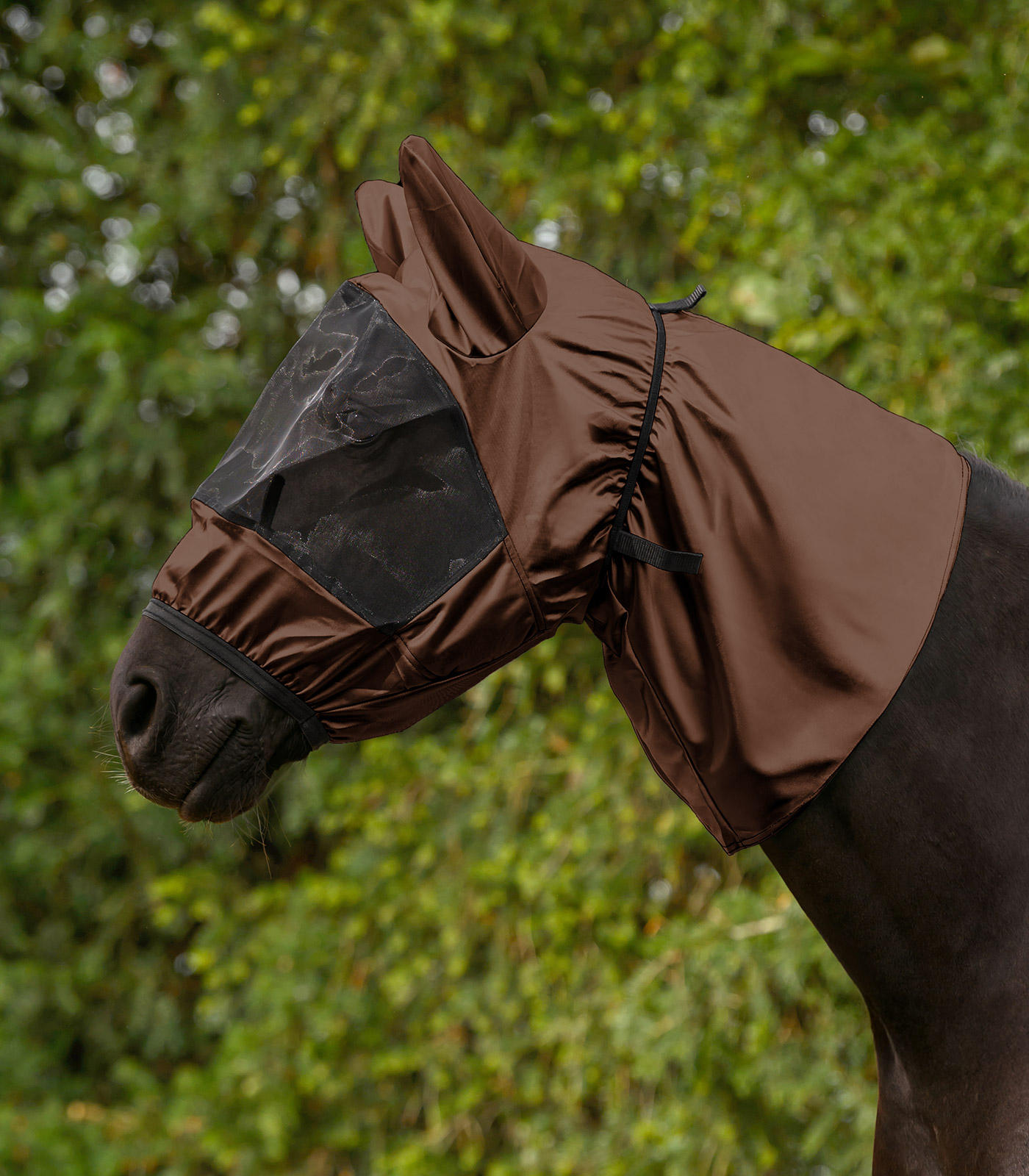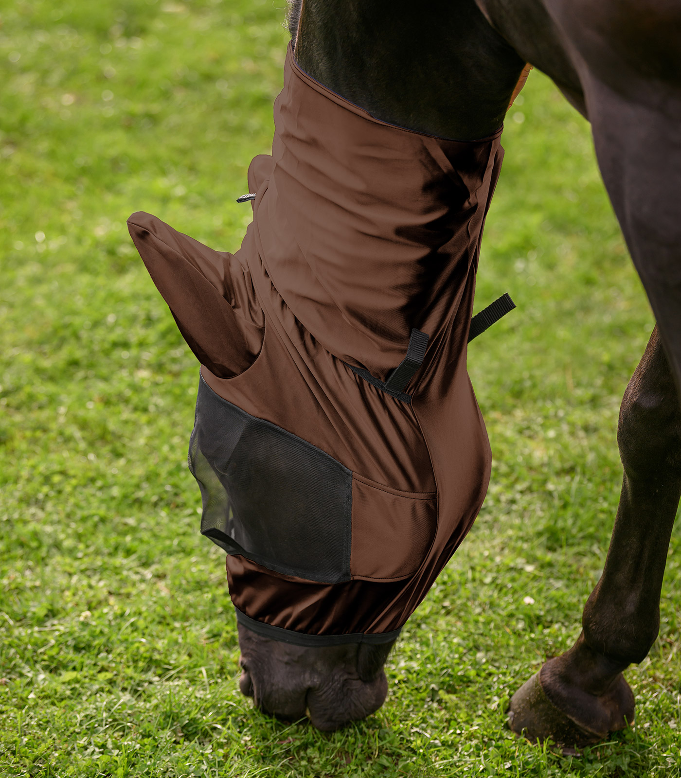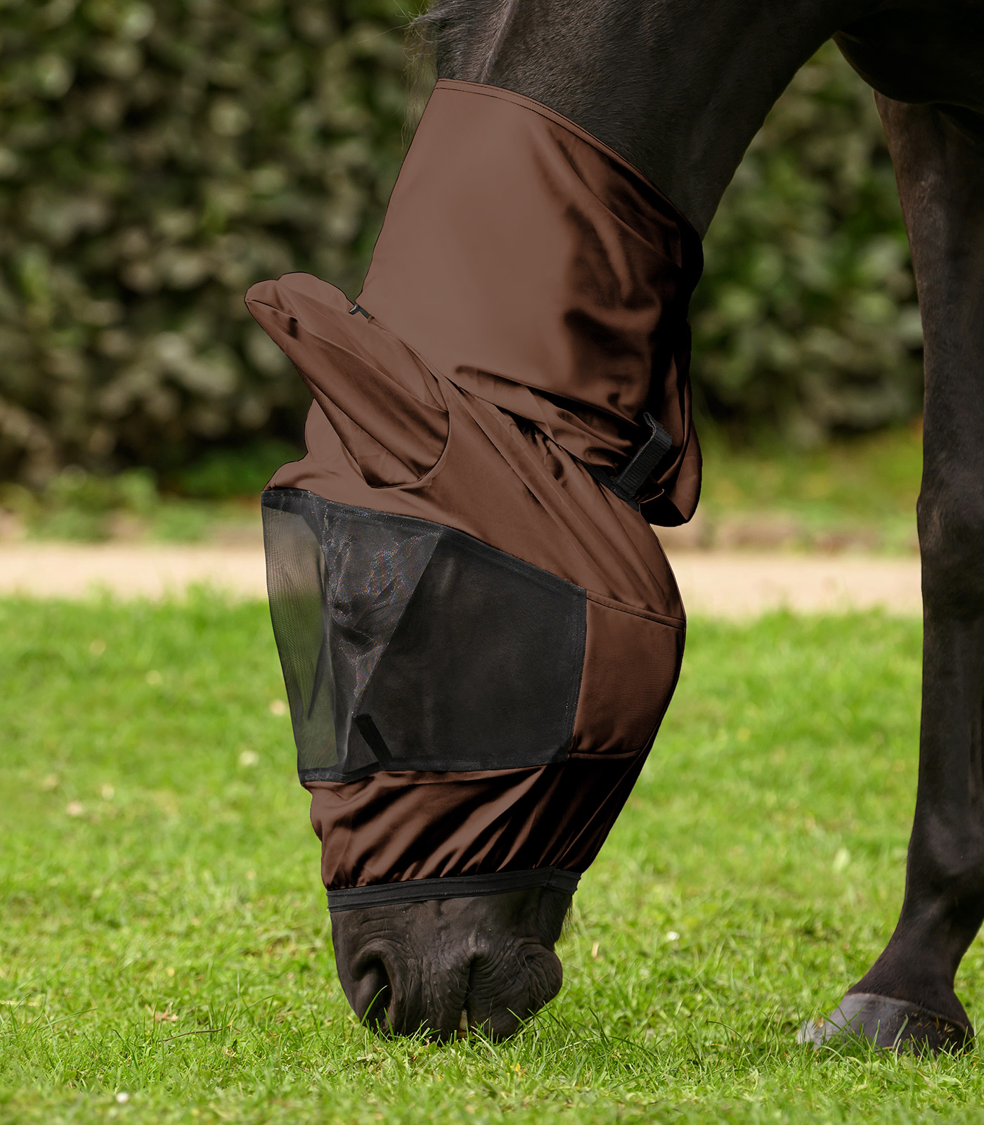 The eczema fly mask features an impressive design with a generous, fine-mesh insert, which provides clear vision and optimum protection at the same time. Shaping darts ensure an ideal fit. The mask can be securely attached to the matching eczema rug using hook-and-loop fasteners, and is compatible with both the Premium and Basic versions.