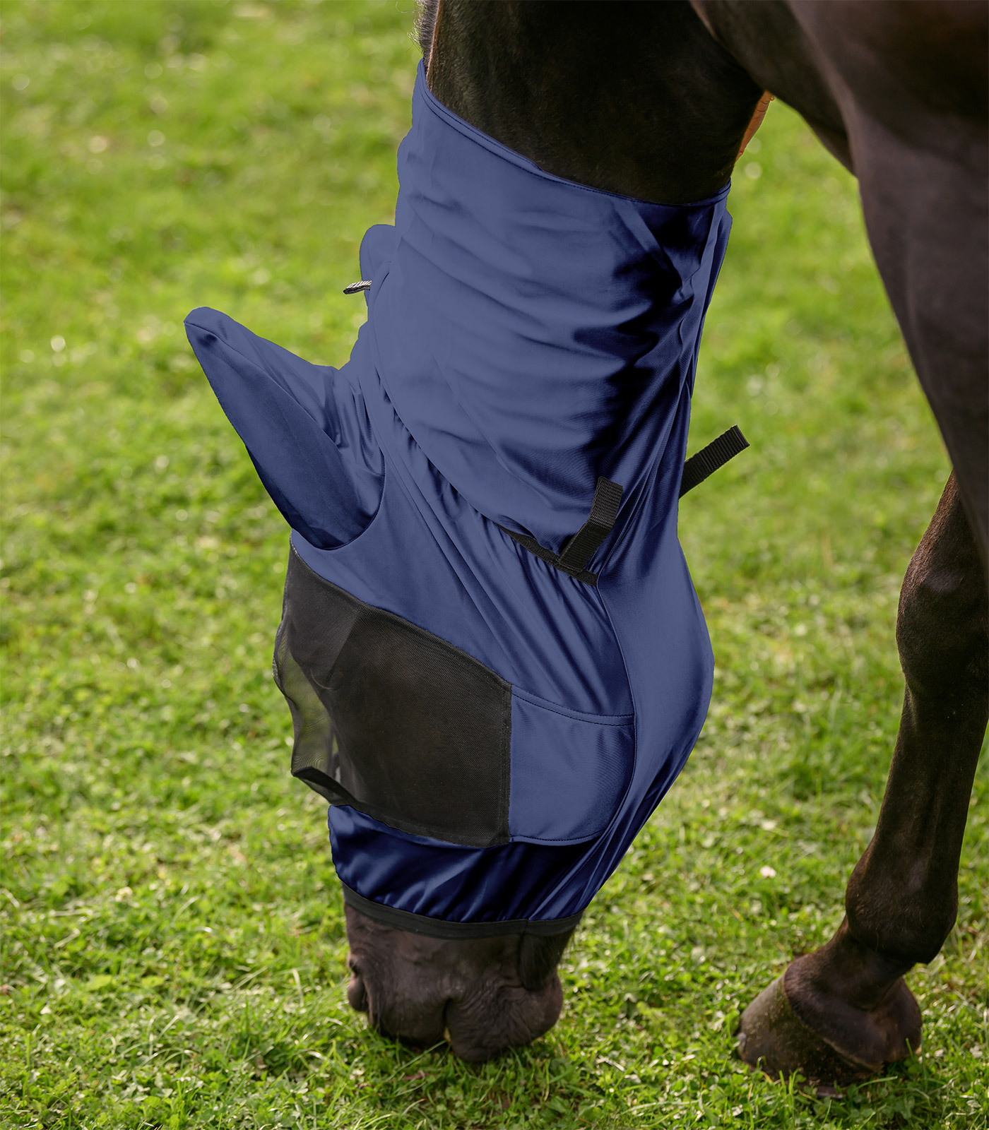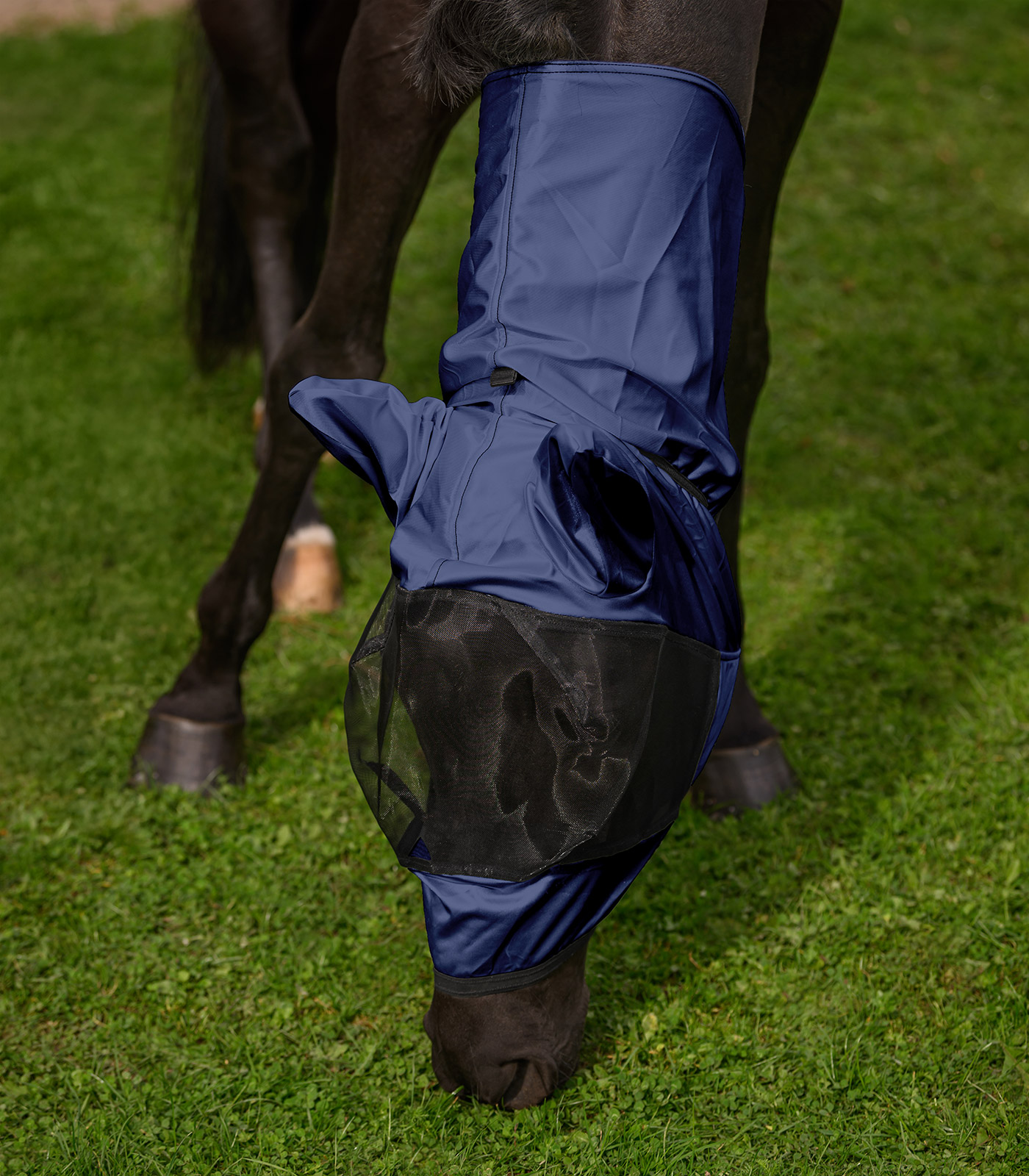 The eczema fly mask features an impressive design with a generous, fine-mesh insert, which provides clear vision and optimum protection at the same time. Shaping darts ensure an ideal fit. The mask can be securely attached to the matching eczema rug using hook-and-loop fasteners, and is compatible with both the Premium and Basic versions.