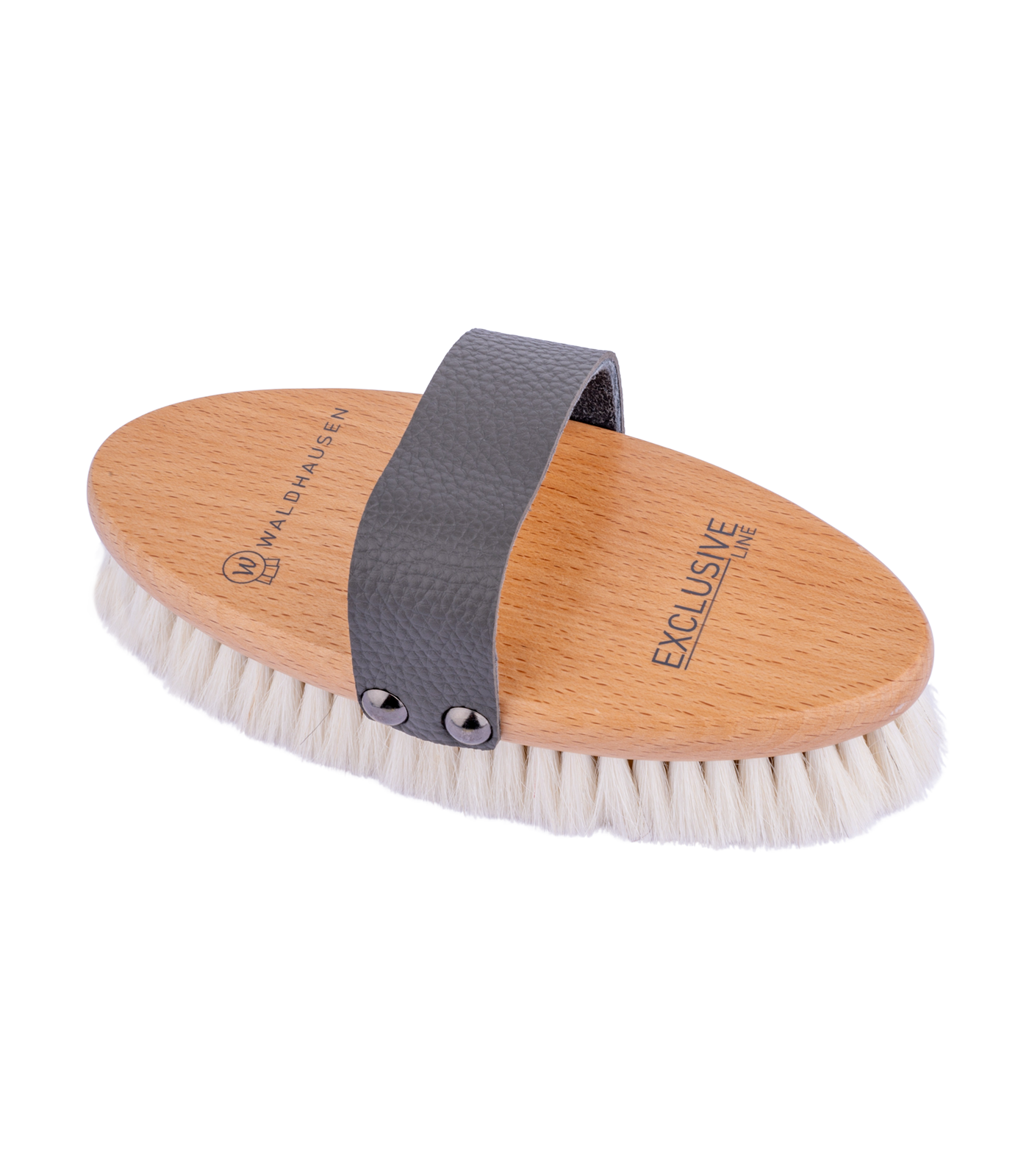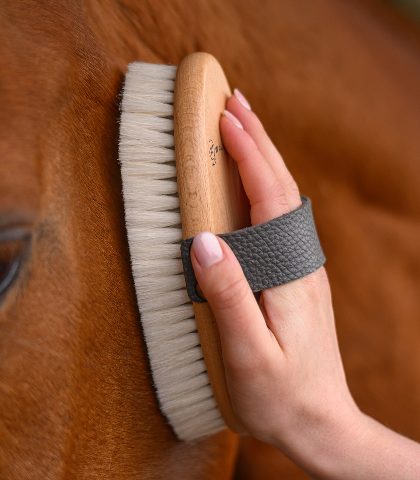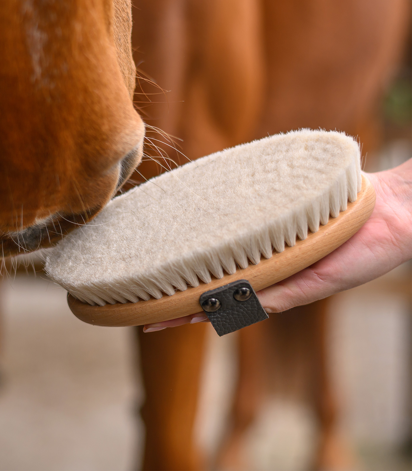 The high-quality goat hair grooming brush gives the coat a beautiful shine and is perfect for finishing. The soft and smooth goat hair does not leave any dust particles on the horse"s coat and also ensures an extra pleasant grooming experience. Natural materials prevent electrostatic charging.