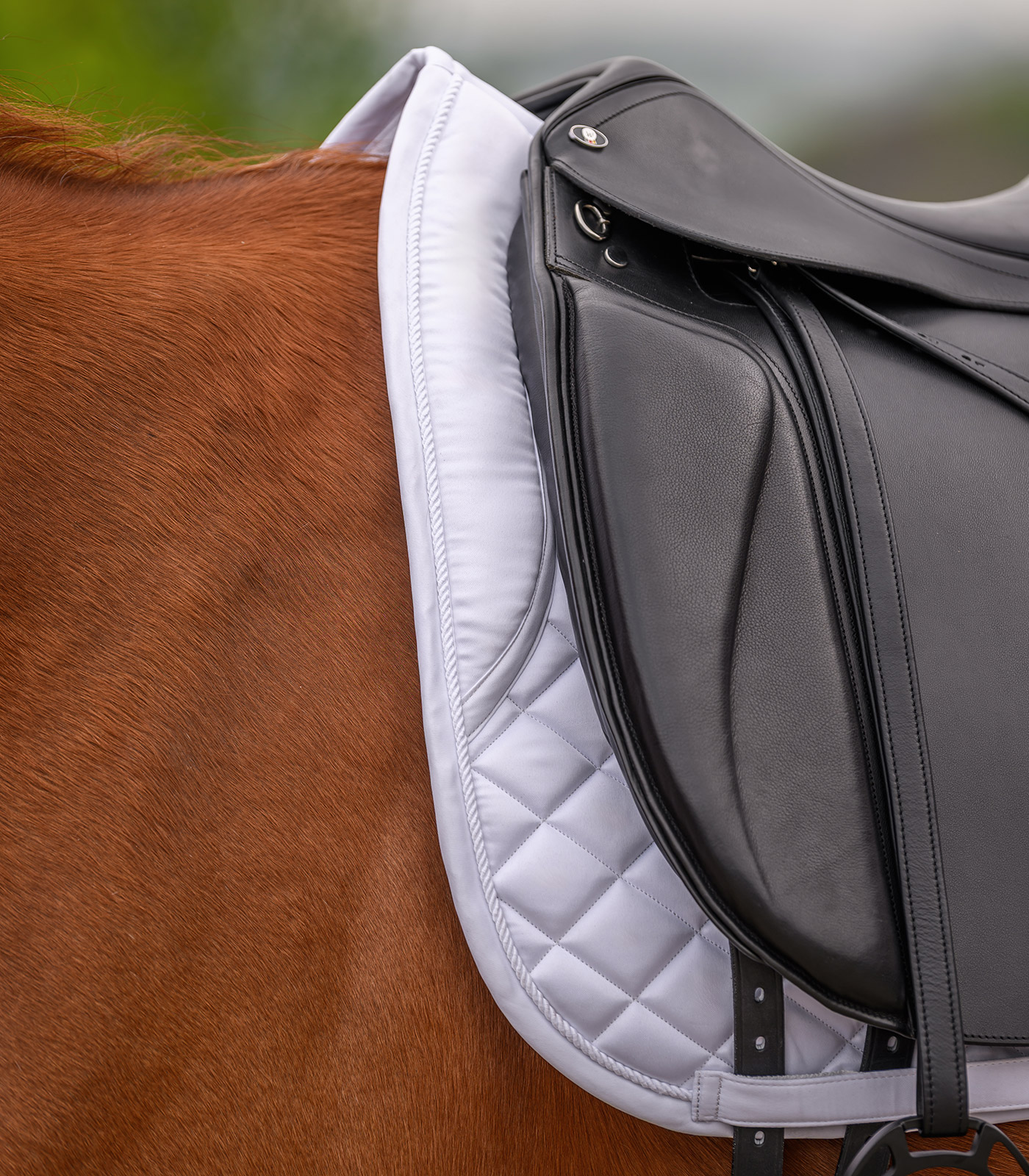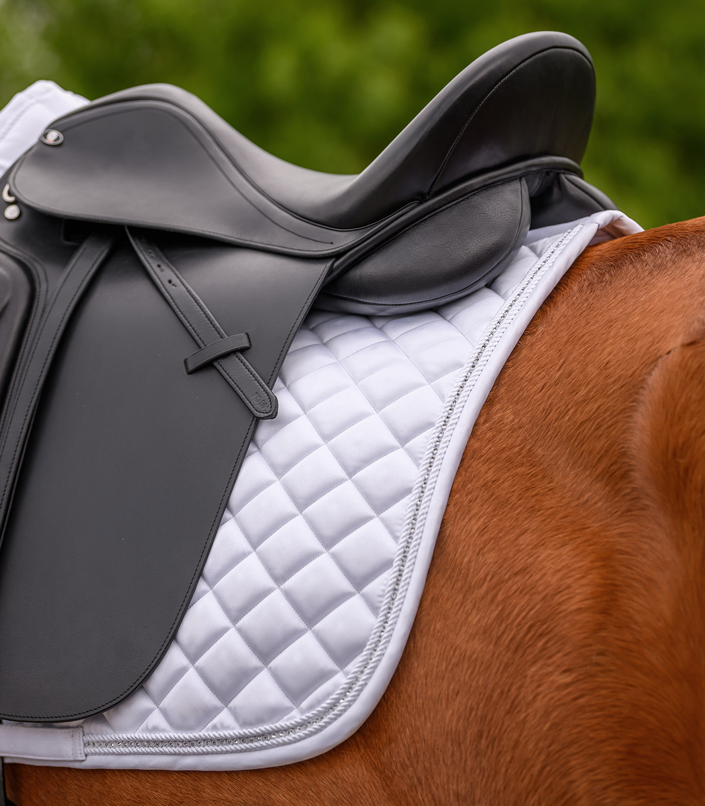 Elegant, high-quality saddle cloth in glossy material. A special detail is the shimmering rhinestone band between two decorative cords. The logo comes in the form of a silver metal plate. To match our Nepal collection.