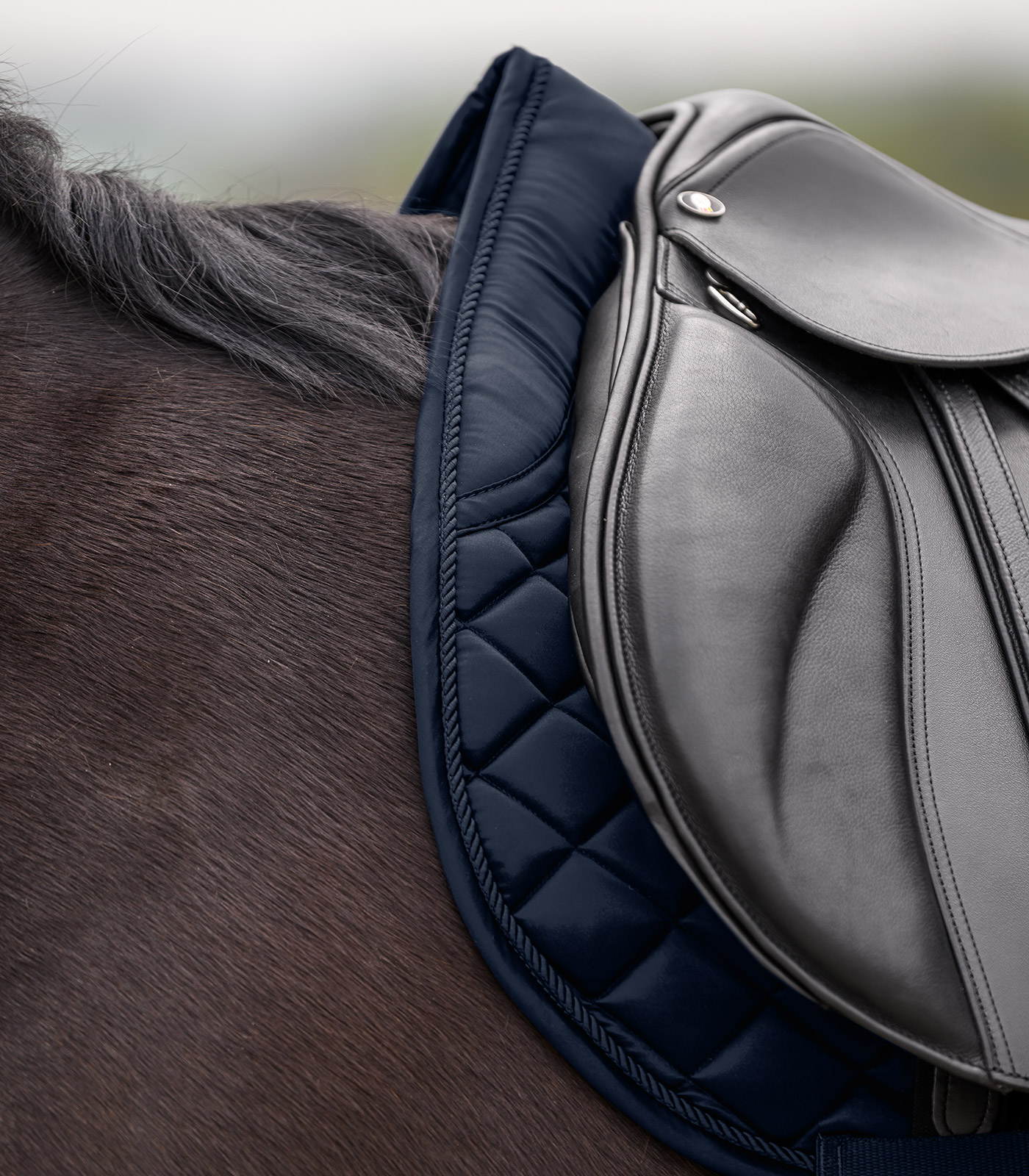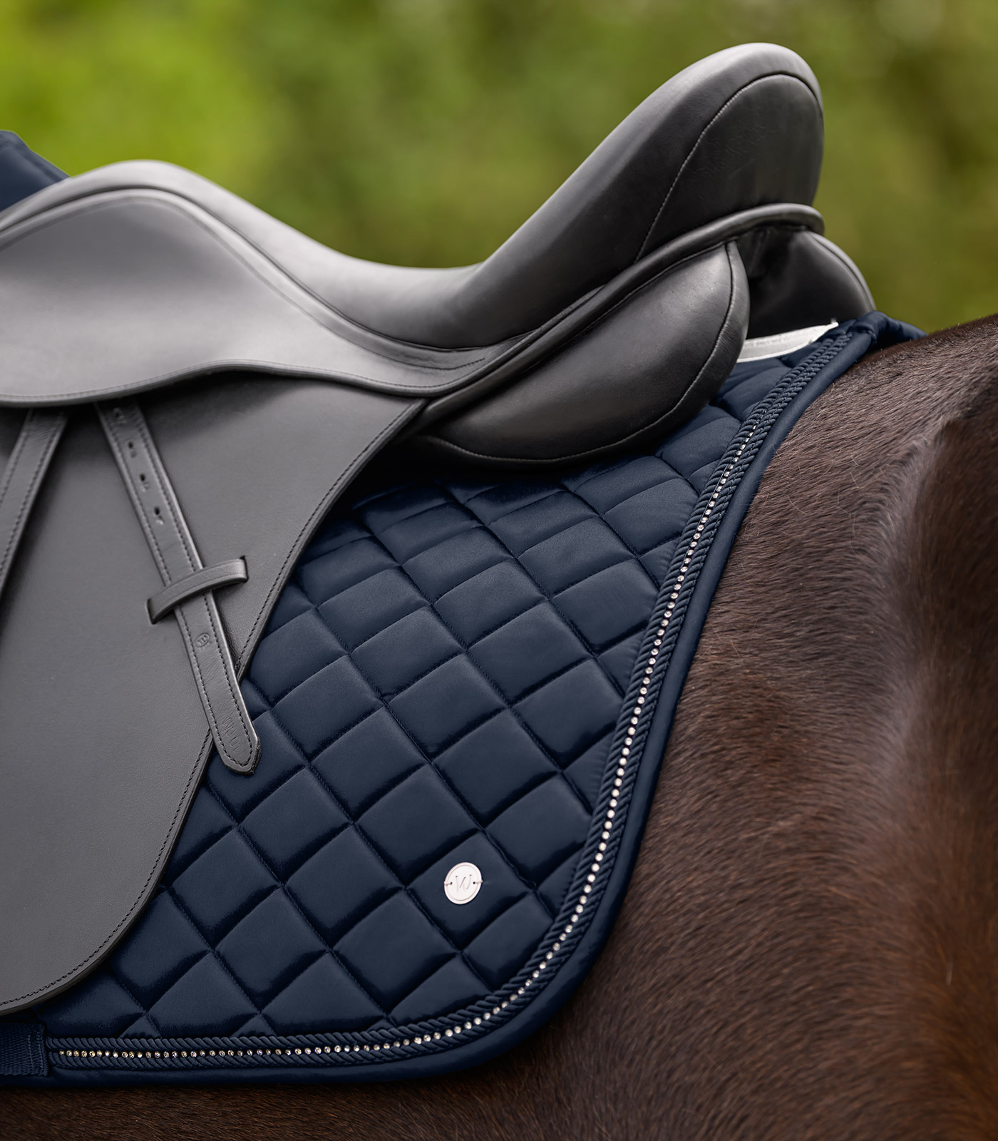 Elegant, high-quality saddle cloth in glossy material. A special detail is the shimmering rhinestone band between two decorative cords. The logo comes in the form of a silver metal plate. To match our Nepal collection.