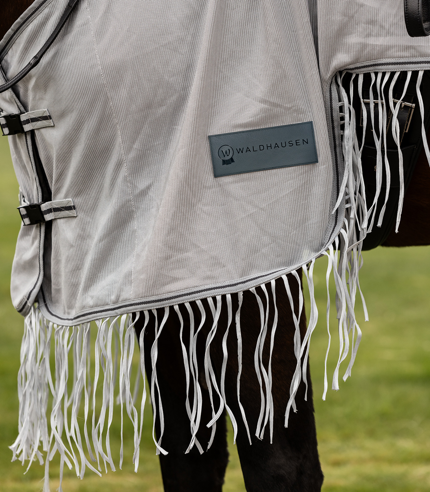 High-quality fly rug made from fine, tightly meshed material. It is equipped with a double clip front fastening, a tail cord, a detachable tail flap and a low-set hindquarters cord. The rug also has rings for attaching a neck piece. The lateral riding cut and reduced lateral depth promote undisturbed and sensitive communication with the horse. Extra-long fringes are also attached to the lower edge of the rug to keep flies and horseflies away from the horse so that you can ride undisturbed.