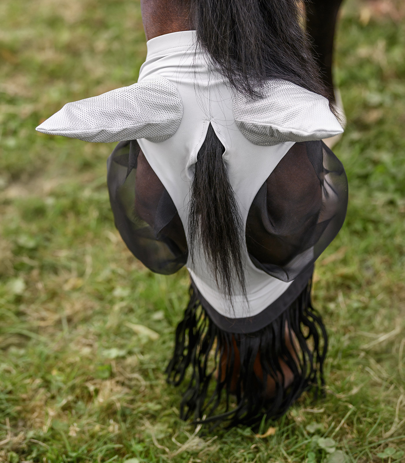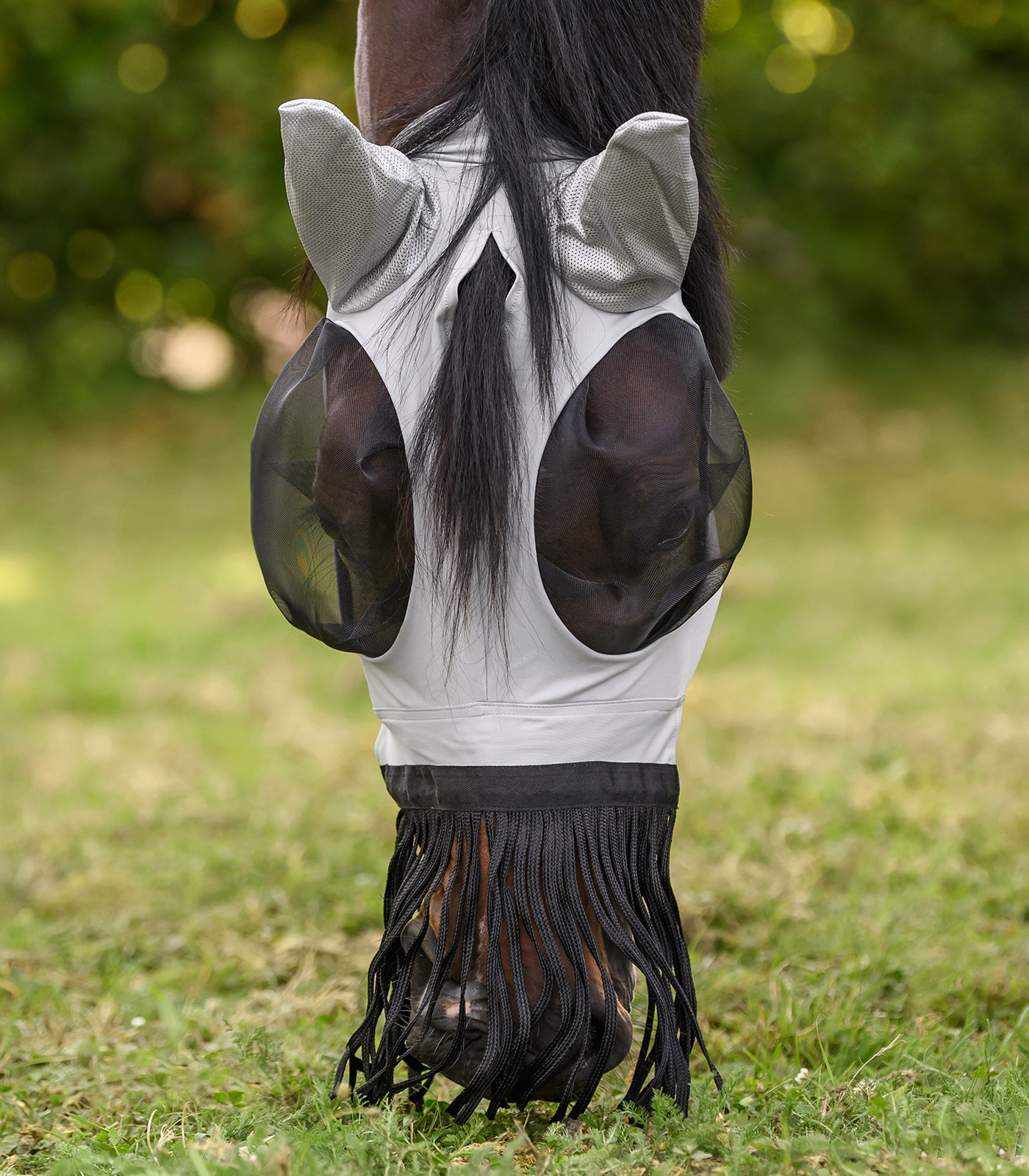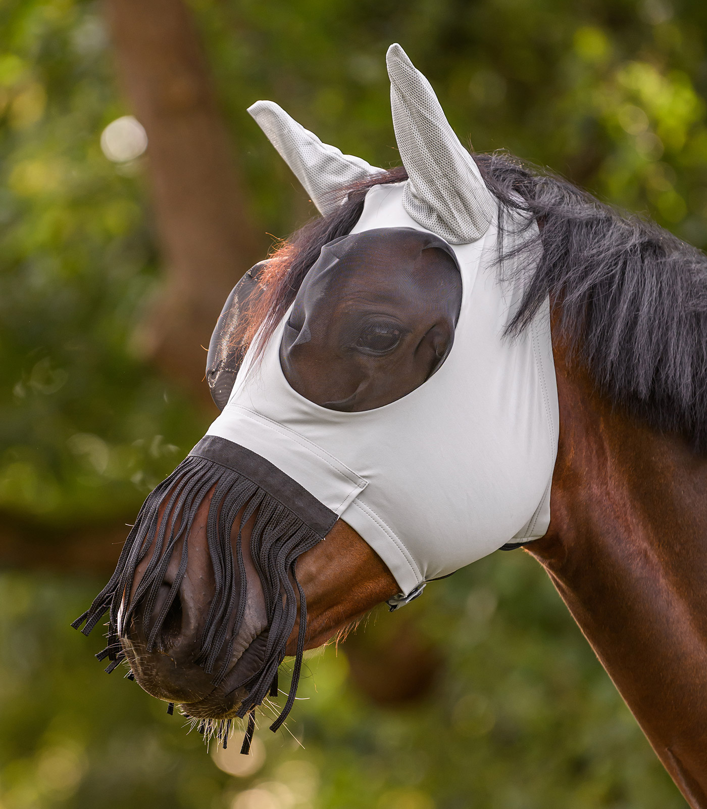 Elastic fly mask for reliable protection against insects. The flexible material adapts perfectly and prevents flies from entering. The generous eye part ensures high wearing comfort. A long zipper makes it easy to put on and take off. The integrated nose fringes provide additional protection for the sensitive nose area.