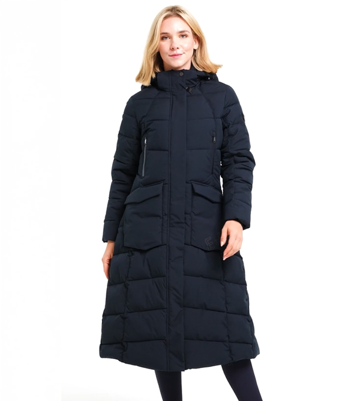 Long quilted coat with down-like filling and extensive features