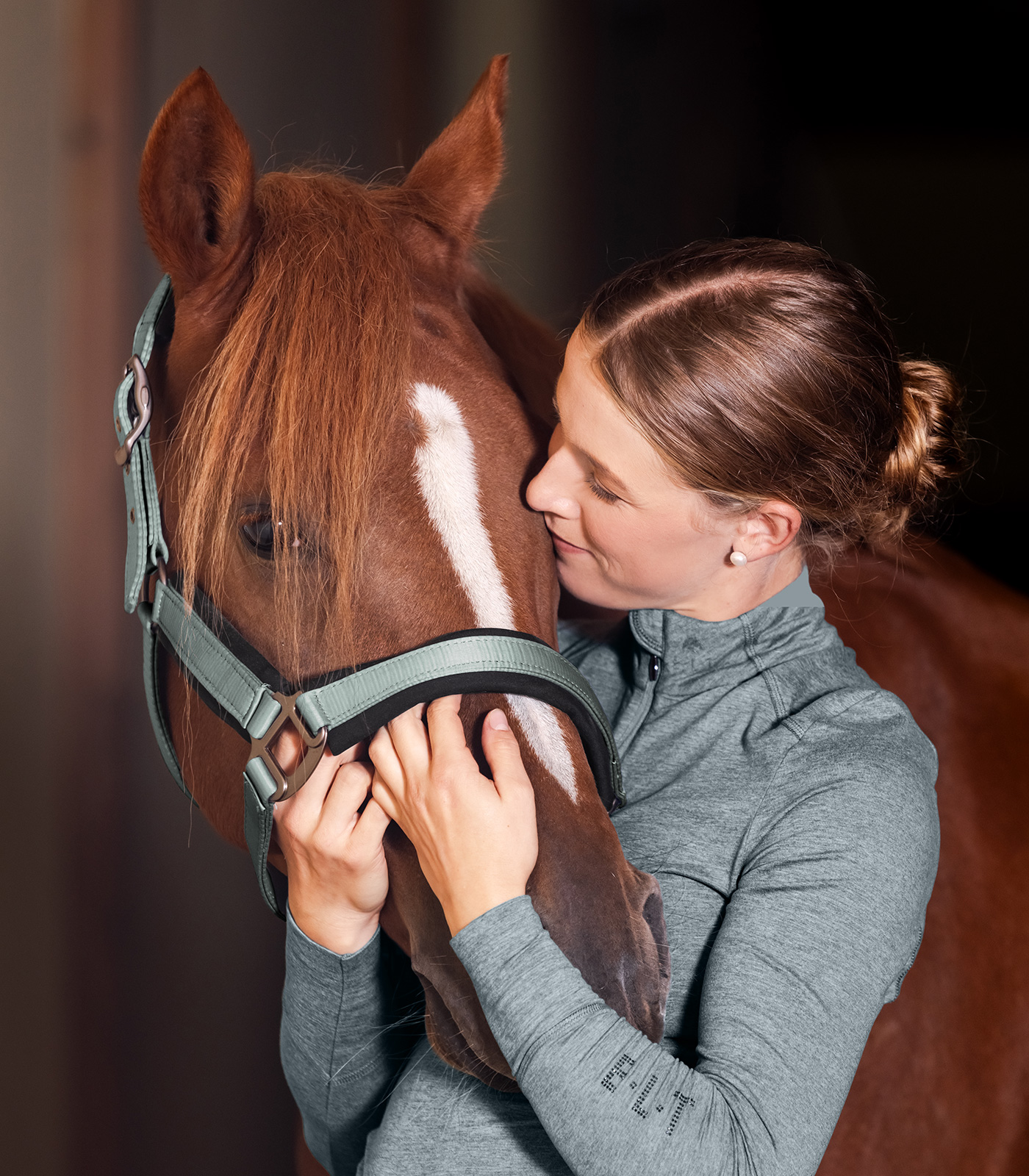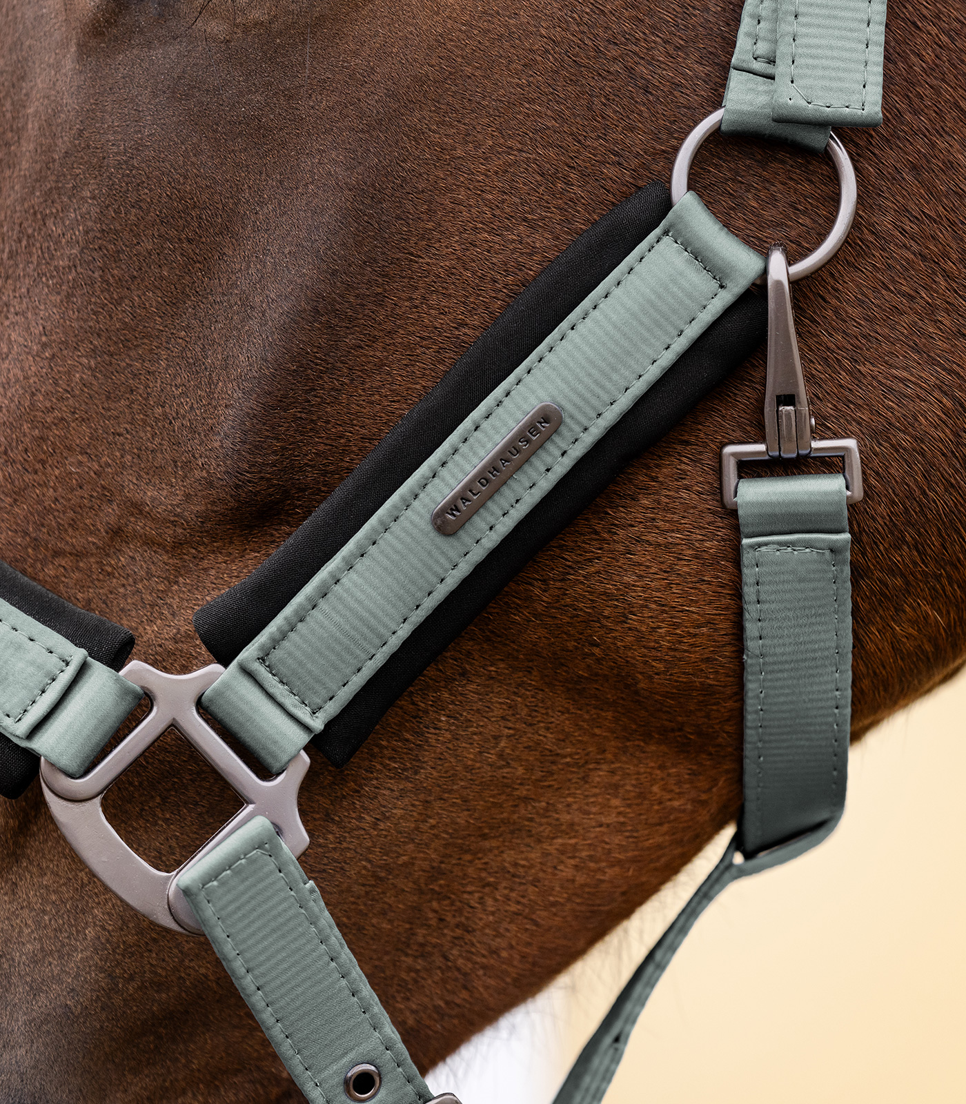 High-quality halter with a fine satin cover. The halter is lined with soft material in the neck, nose and cheek sections, which makes it very comfortable to wear. Single adjustment on the chin strap and adjustable on both sides of the headpiece. With dark fittings, carabiner and anthracite Waldhausen logo.