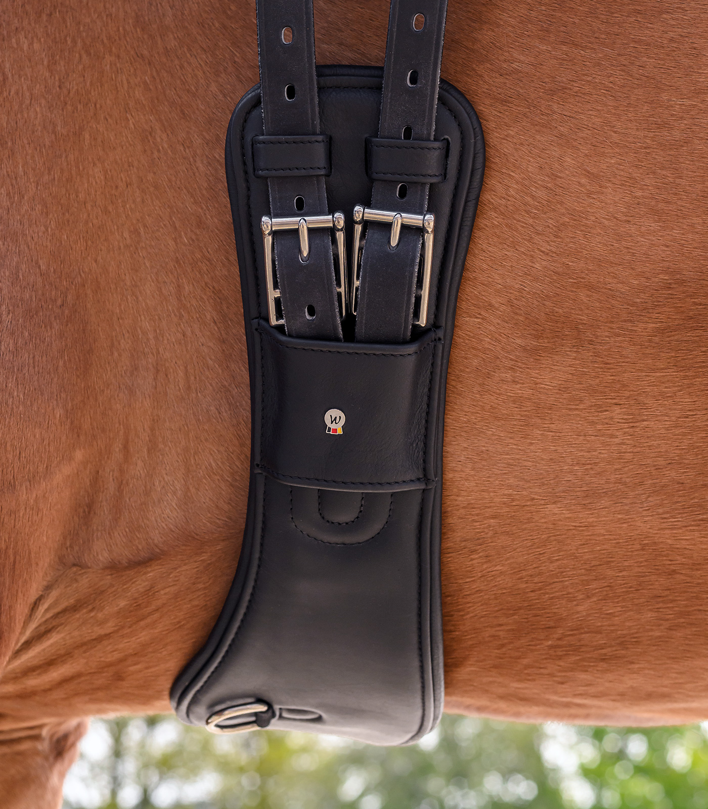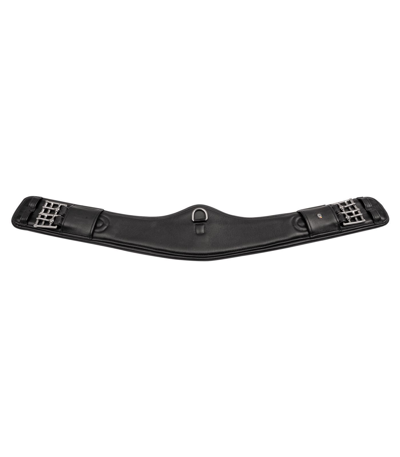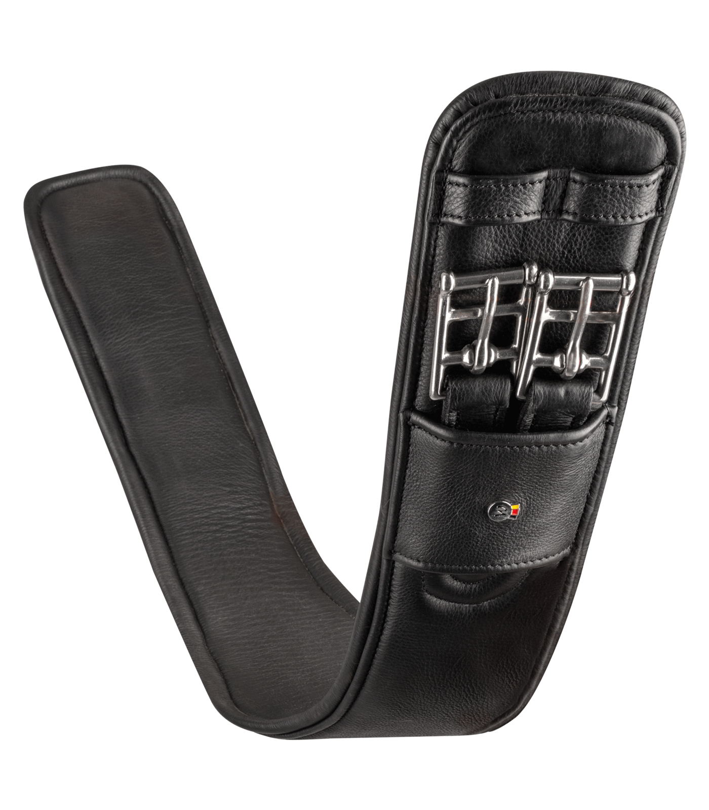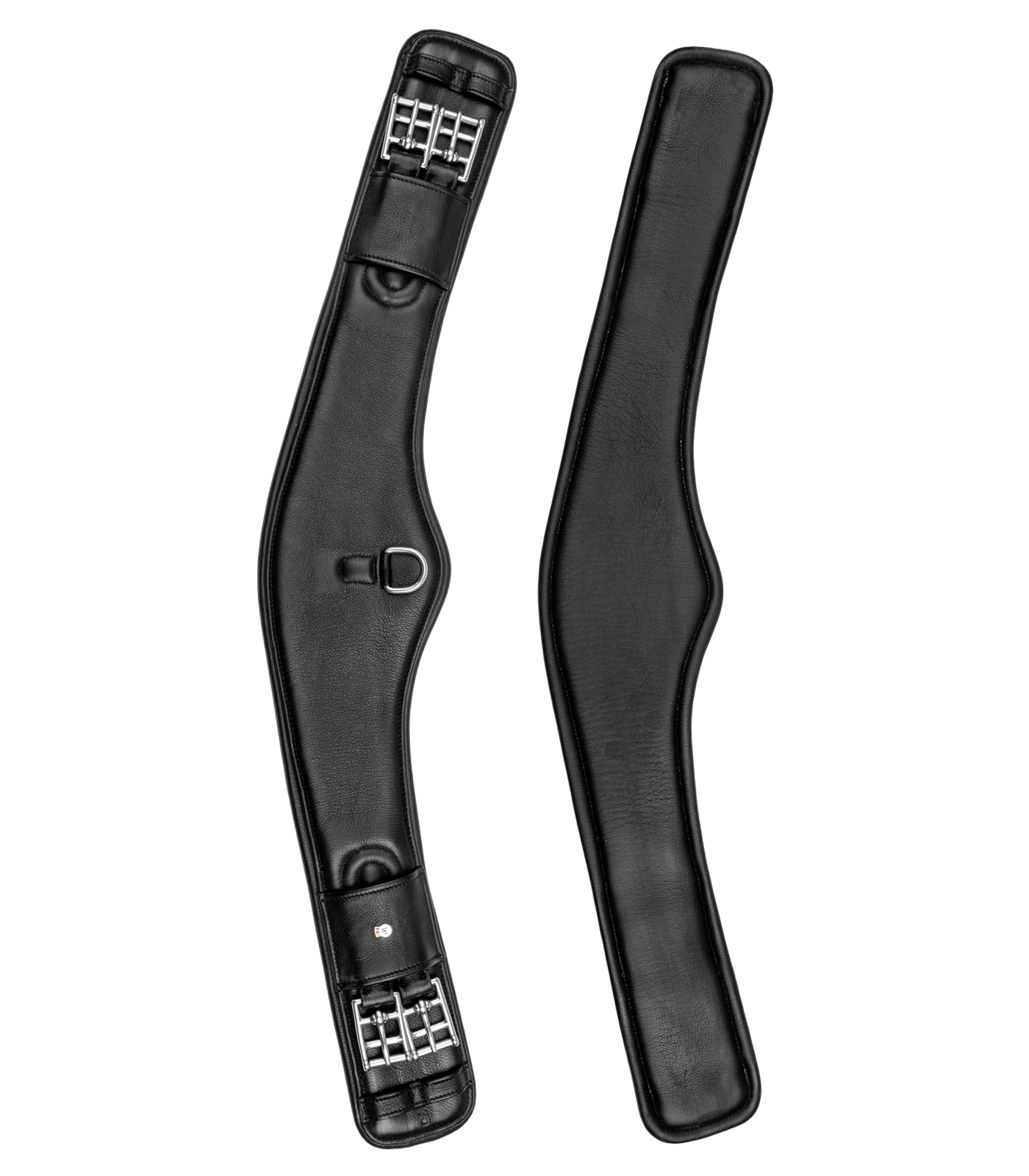 Cincha curvada para mejorar el ajuste de la cincha en caballos barrigudos y cuando la silla de montar tiene la tendencia de resbalar hacia adelante. En cuero de altísima calidad con un acolchado muy suave. Con anilla en D y hebillas de rodillo de acero inoxidable. Con inserciones elásticas en ambos lados.