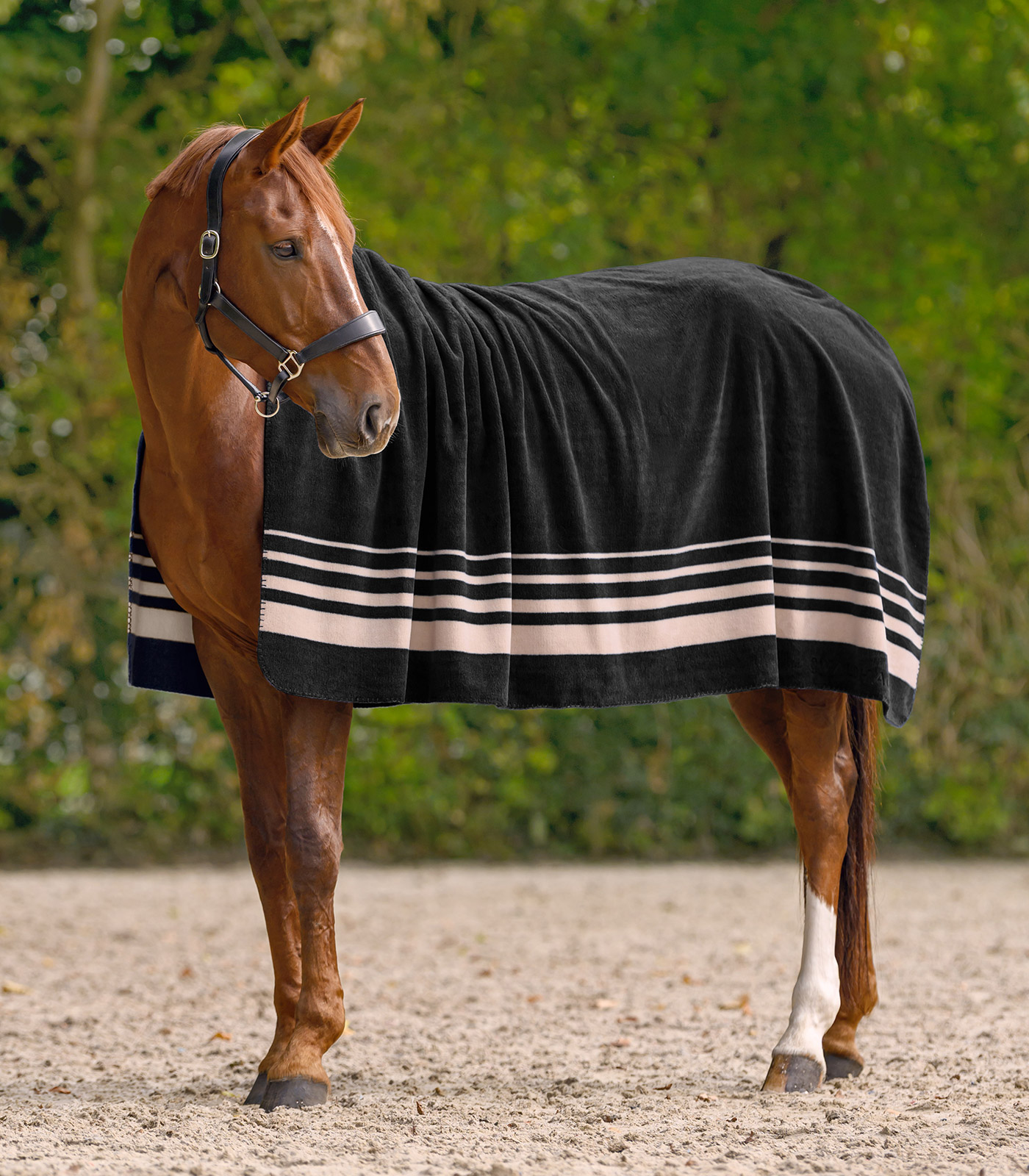 La manta de tejido polar Sölden atrae todas las miradas. El material grueso (330 g/m²) proporciona un calor óptimo para el caballo y el jinete en los días fríos. Gracias a su versatilidad, la manta polar Sölden es un accesorio todoterreno. Las rayas en el borde inferior de la manta aportan estilo.