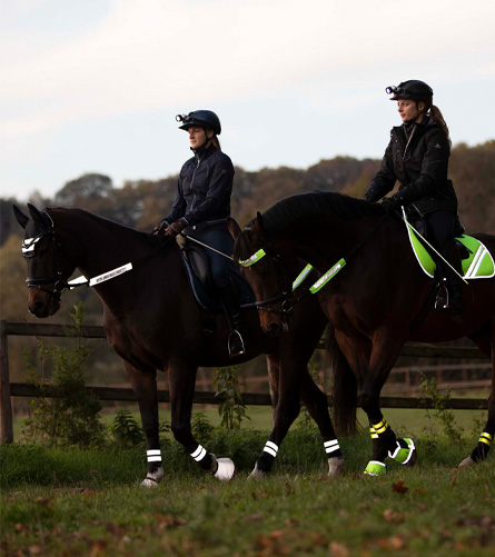 Riders must be sufficiently visible during dusk, darkness, or poor visibility (e.g., fog, snow, rain). A non-blinding white light must be carried on the left side, visible forward and backward. Additional reflective leg bands on the horse and reflective clothing on the rider are highly recommended, as well as a boot light on the left.