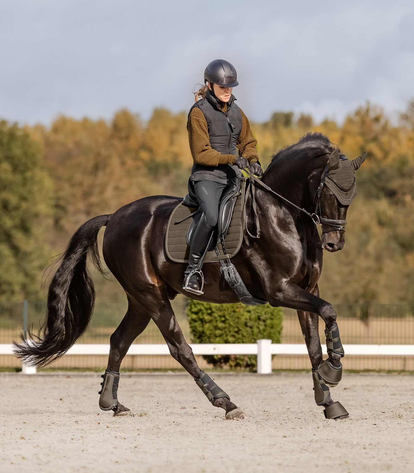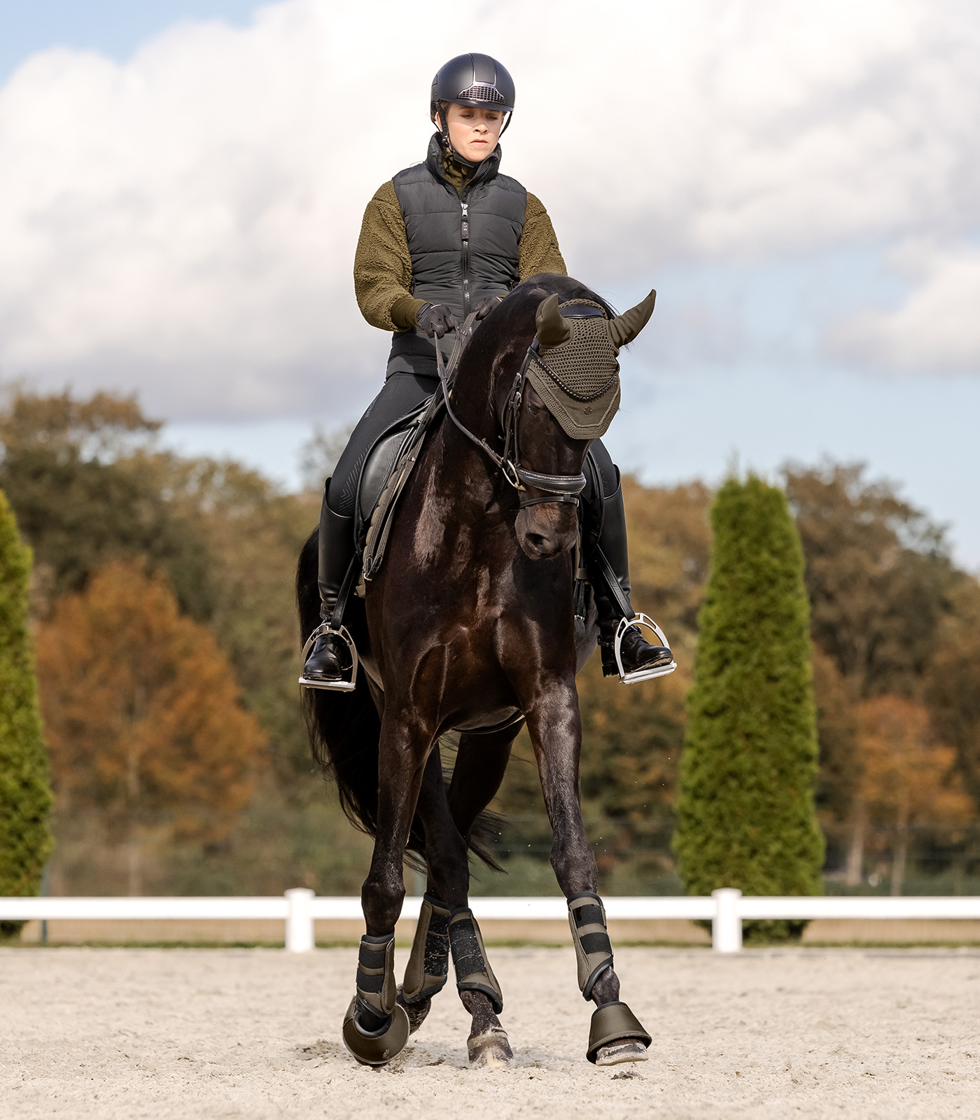 Bonnet anti-mouches haut de gamme assorti à la collection St. Gallen Cord. L"empiècement en velours côtelé constitue un détail particulièrement élégant. La matière élastique au niveau des oreilles offre un grand confort au cheval. Une plaque métallique de couleur anthracite ainsi qu"un cordon décoratif viennent couronner le tout.