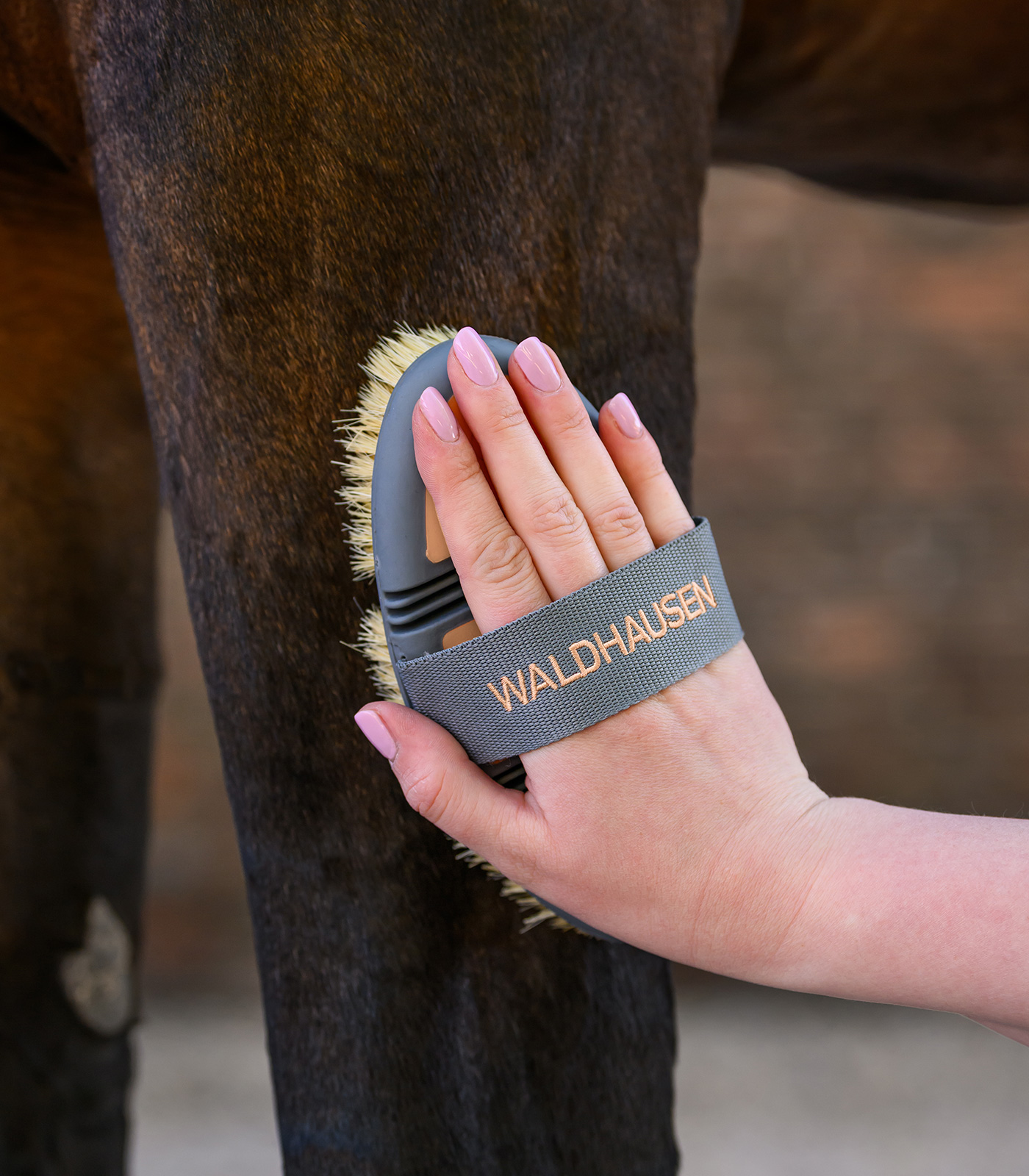 Grâce à ses poils naturels robustes, elle est parfaite pour éliminer la saleté tenace, comme la boue, sur le cheval.