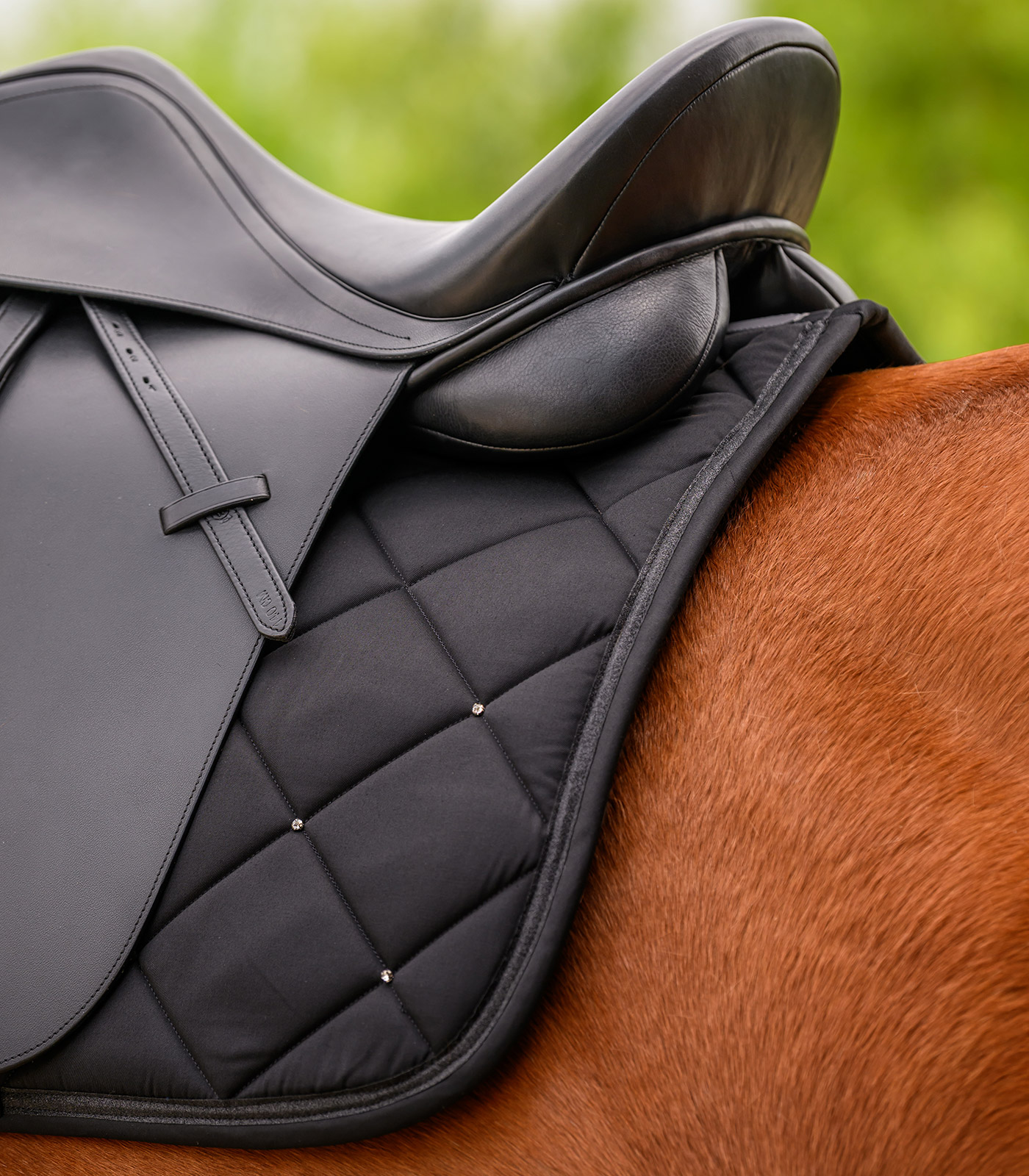 Chabraque d’excellente qualité ornée d’un ruban scintillant. De par l’ajout de strass scintillants, personne ne peut ignorer cette élégante chabraque. La face inférieure fonctionnelle assure une respiration optimale. Les 8 mm de mousse associés aux 250 g/m² d’ouate assurent une répartition optimale de la pression.