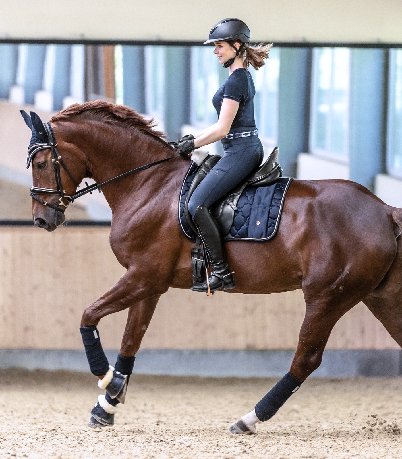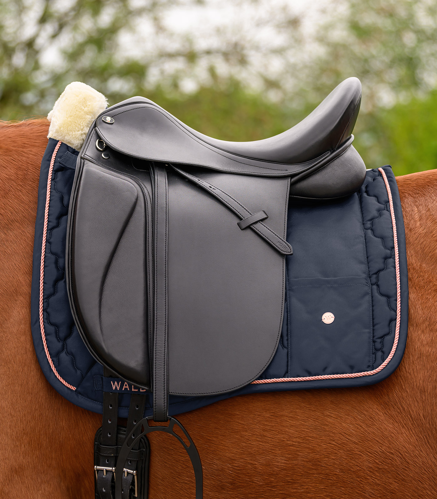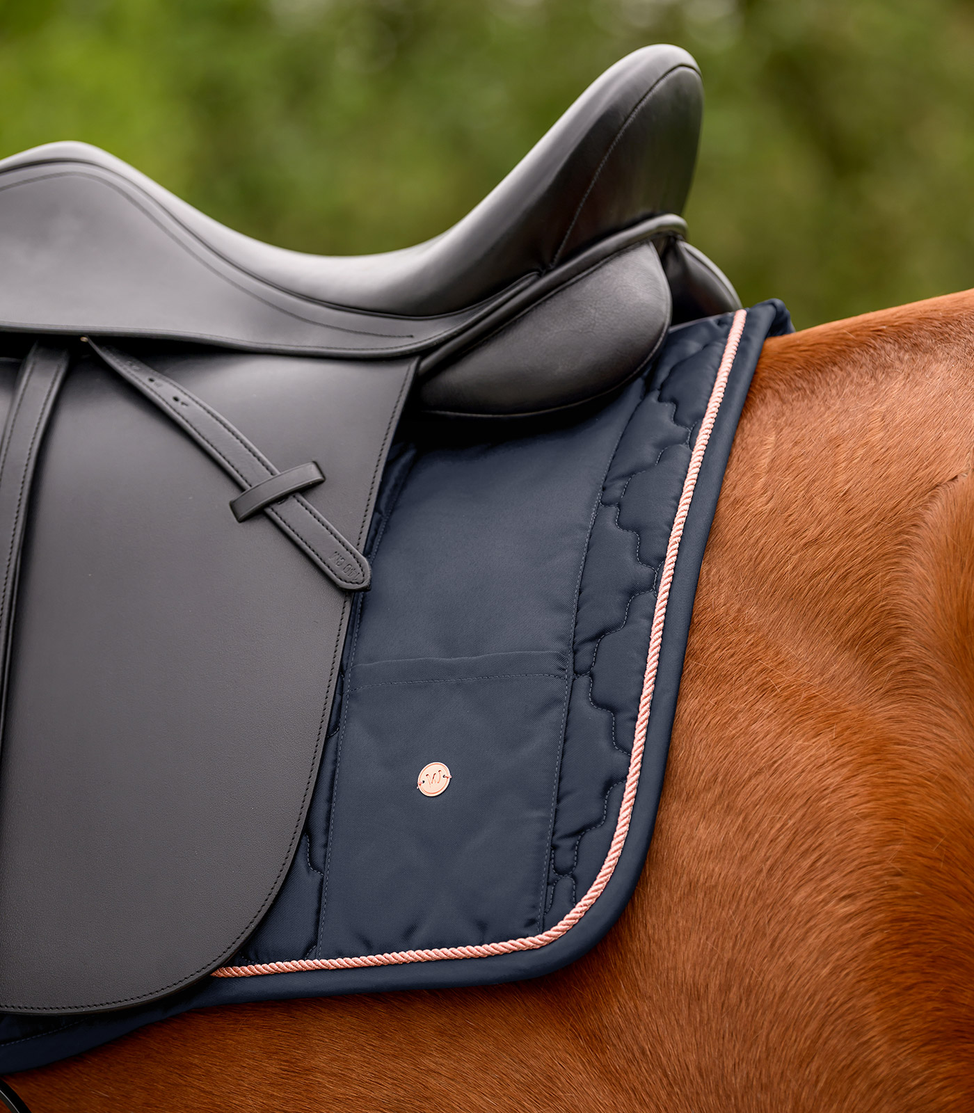 Chabraque de grande qualité au rembourrage moelleux sur le garrot, avec une petite poche pouvant contenir des friandises, mouchoirs, etc. Le motif floral de la surpiqûre, un cordon et une petite plaque métallique donnent à cette chabraque un aspect original. Sa coupe anatomique compacte, son rembourrage à 200 g/m² et ses 10 mm de mousse garantissent un grand confort et une excellente répartition du poids. Assortie à notre collection Modern Rosé