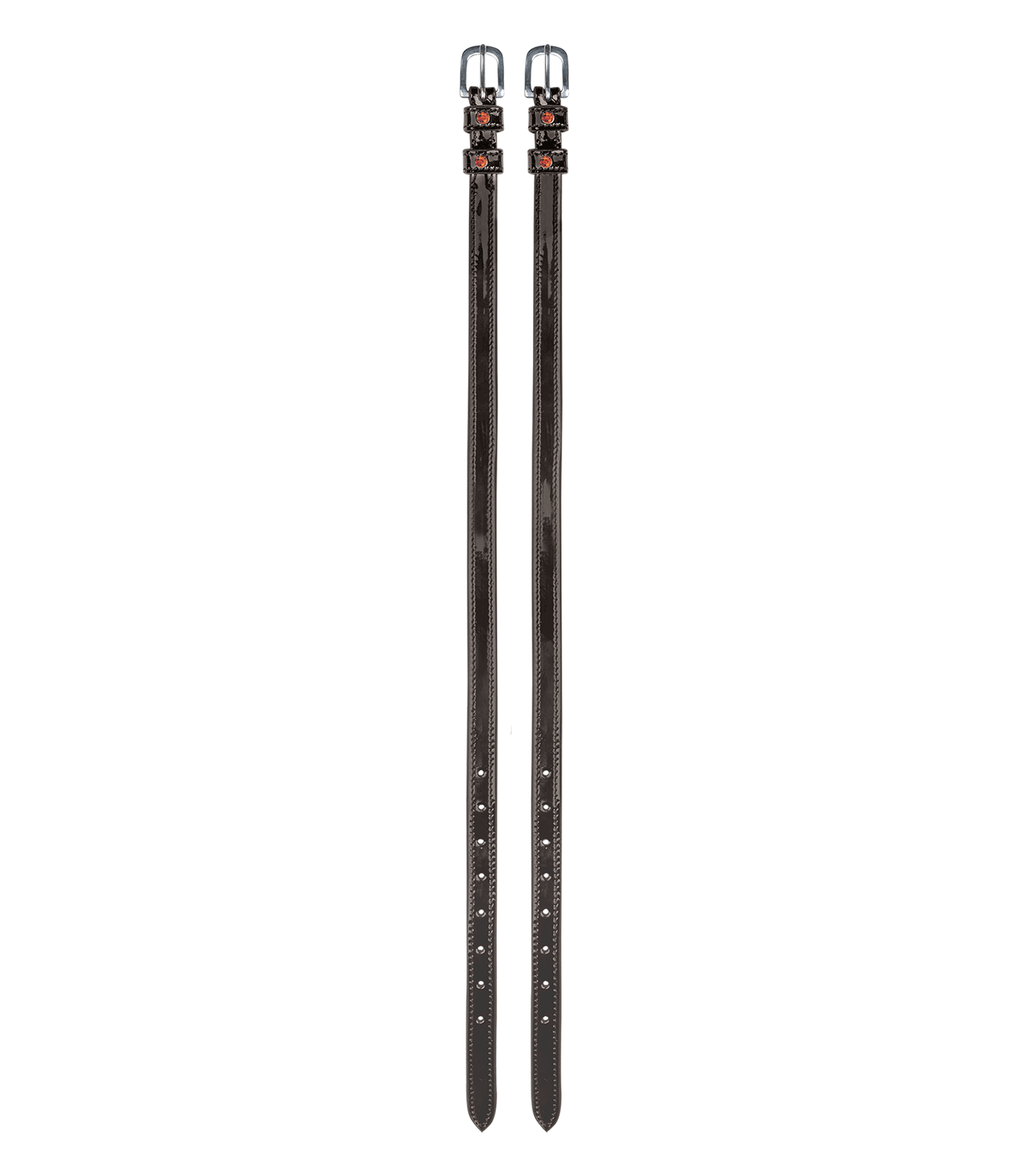 Lanières d’éperons en cuir verni, strass sur chaque boucle. La paire
