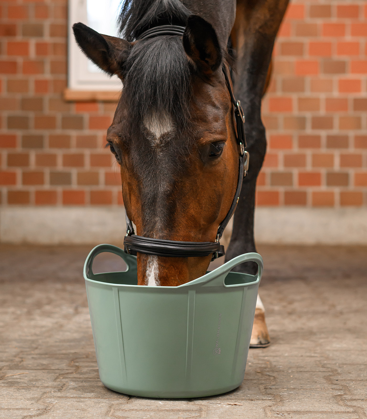 Récipient solide en plastique très souple, pratique à l’écurie comme dans toute la maison. Équipé de 2 poignées permettant un maniement plus facile. S’emploie comme seau pour le transport, la nourriture ou l’eau.