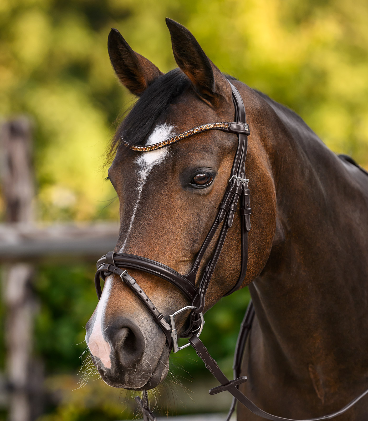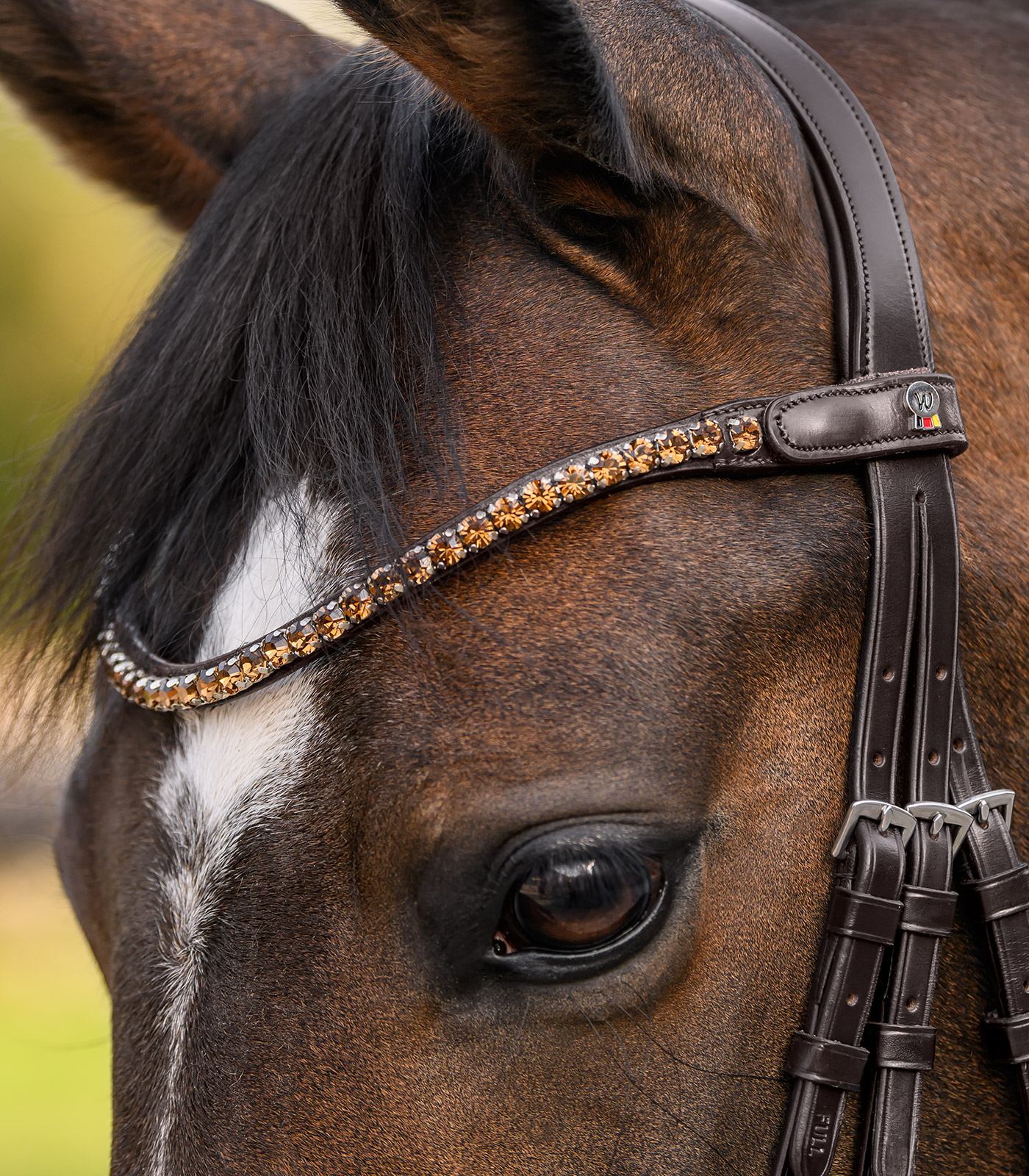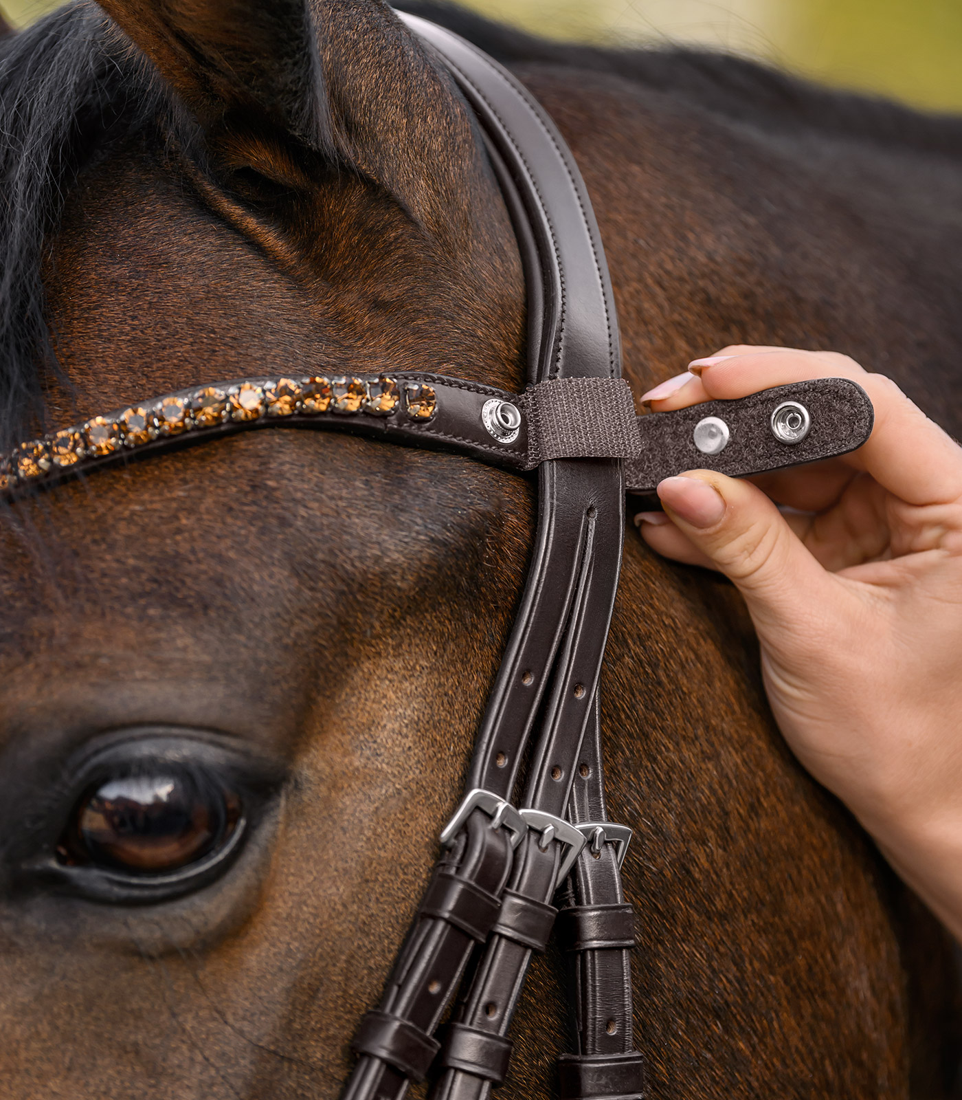 Frontal incurvé avec grosses pierres scintillantes. Grâce à un bouton-pression pratique et à une fermeture Velcro, le frontal se fixe facilement au bridon et se change tout aussi rapidement.