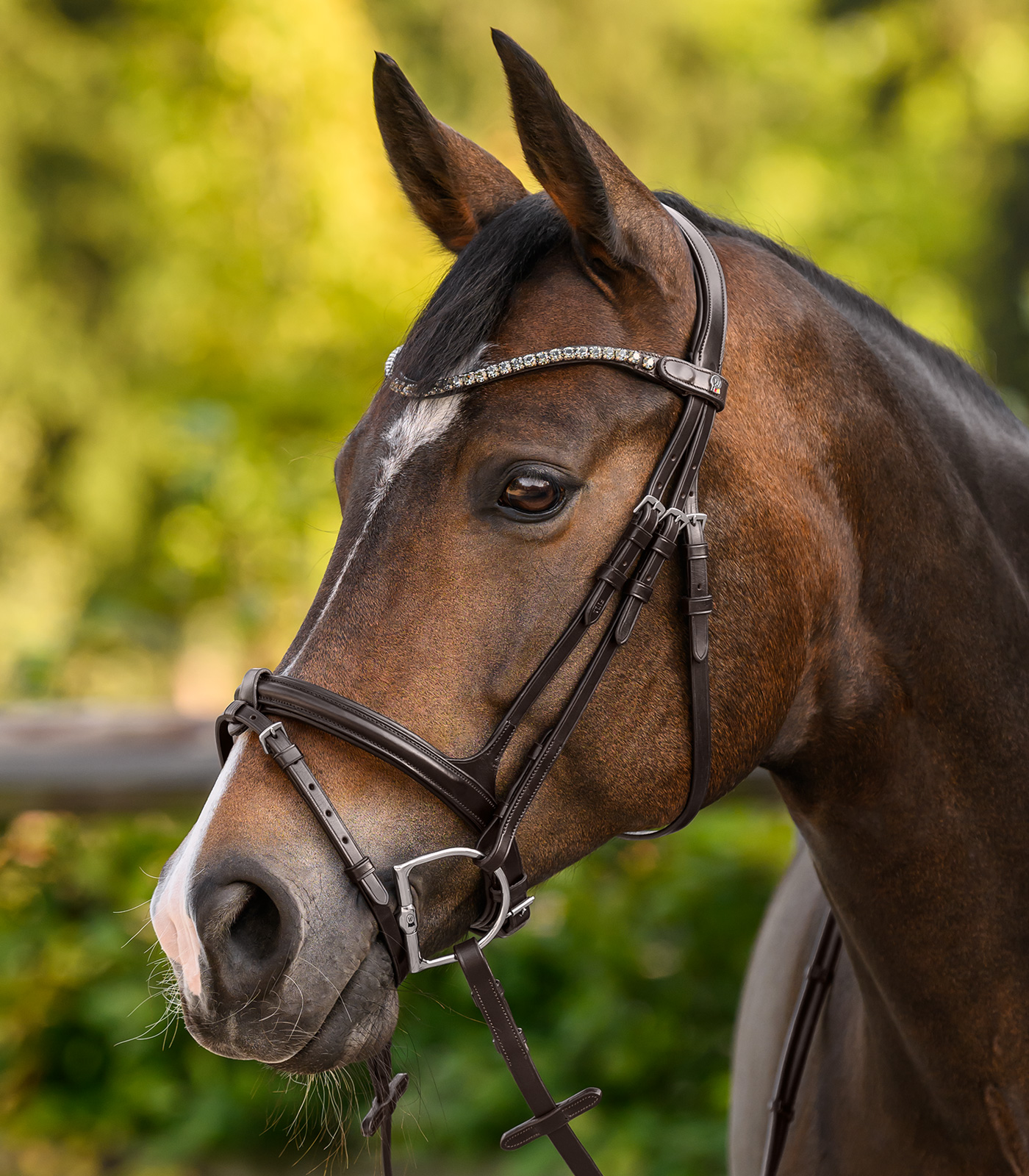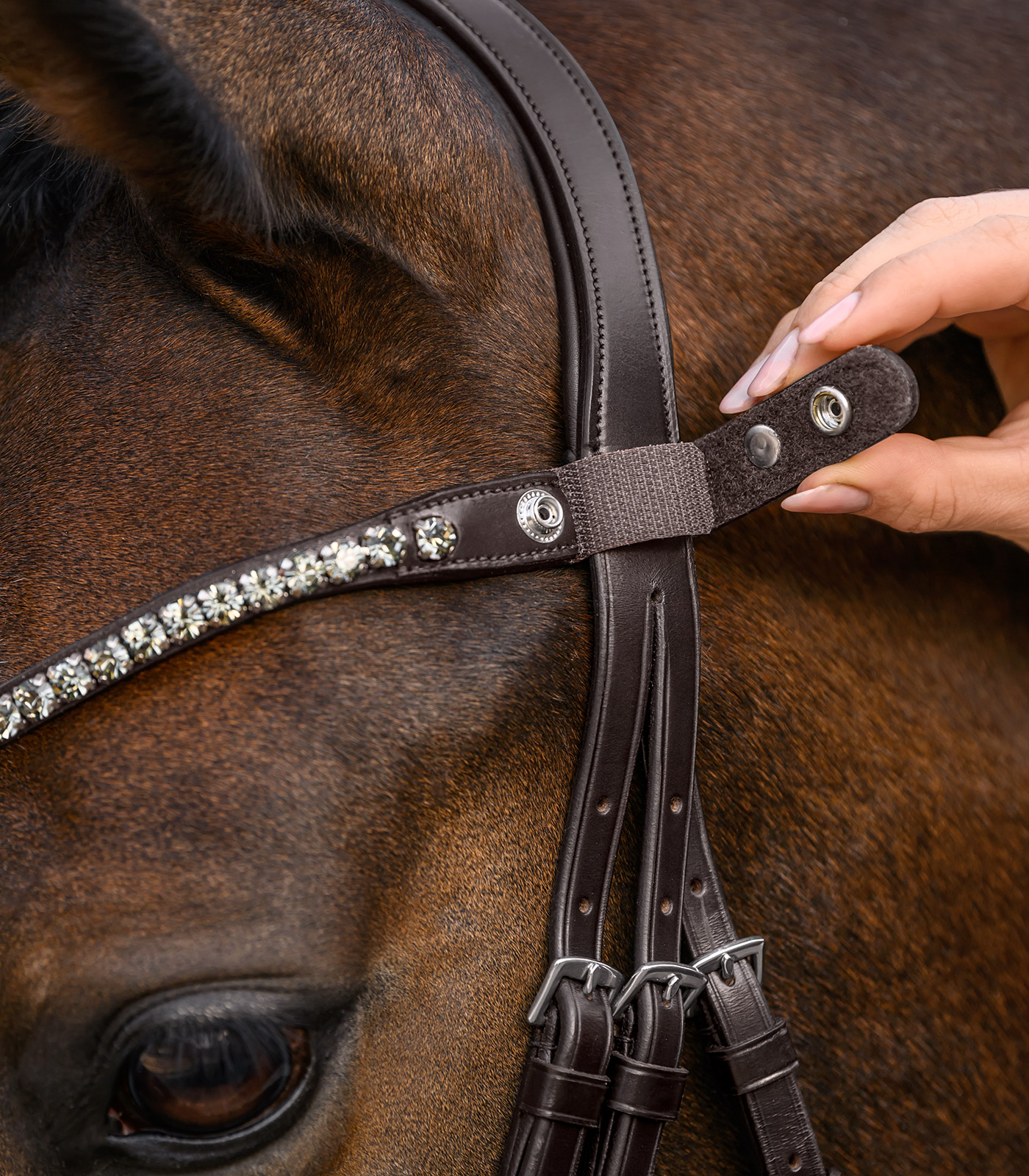 Frontal incurvé avec grosses pierres scintillantes. Grâce à un bouton-pression pratique et à une fermeture Velcro, le frontal se fixe facilement au bridon et se change tout aussi rapidement.