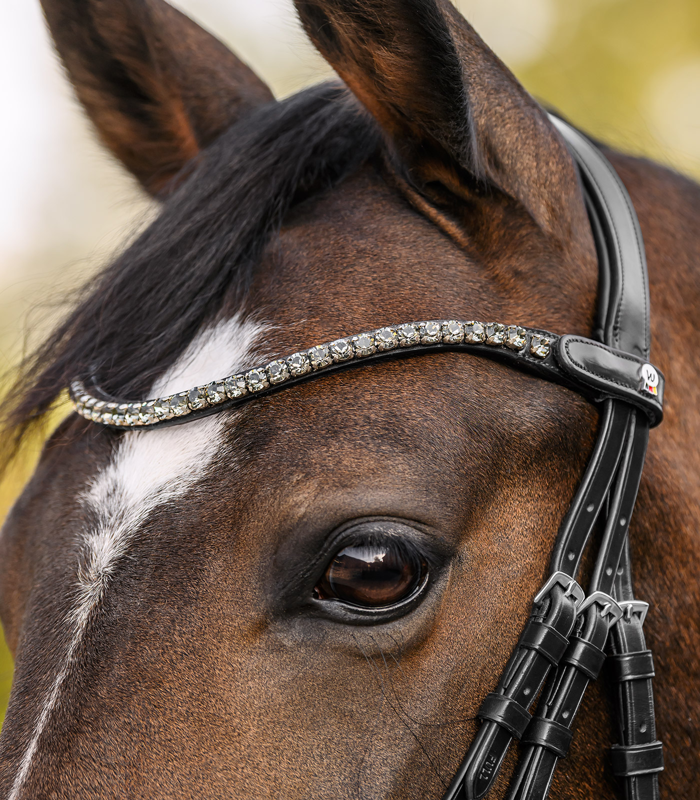 Frontal incurvé avec grosses pierres scintillantes. Grâce à un bouton-pression pratique et à une fermeture Velcro, le frontal se fixe facilement au bridon et se change tout aussi rapidement.