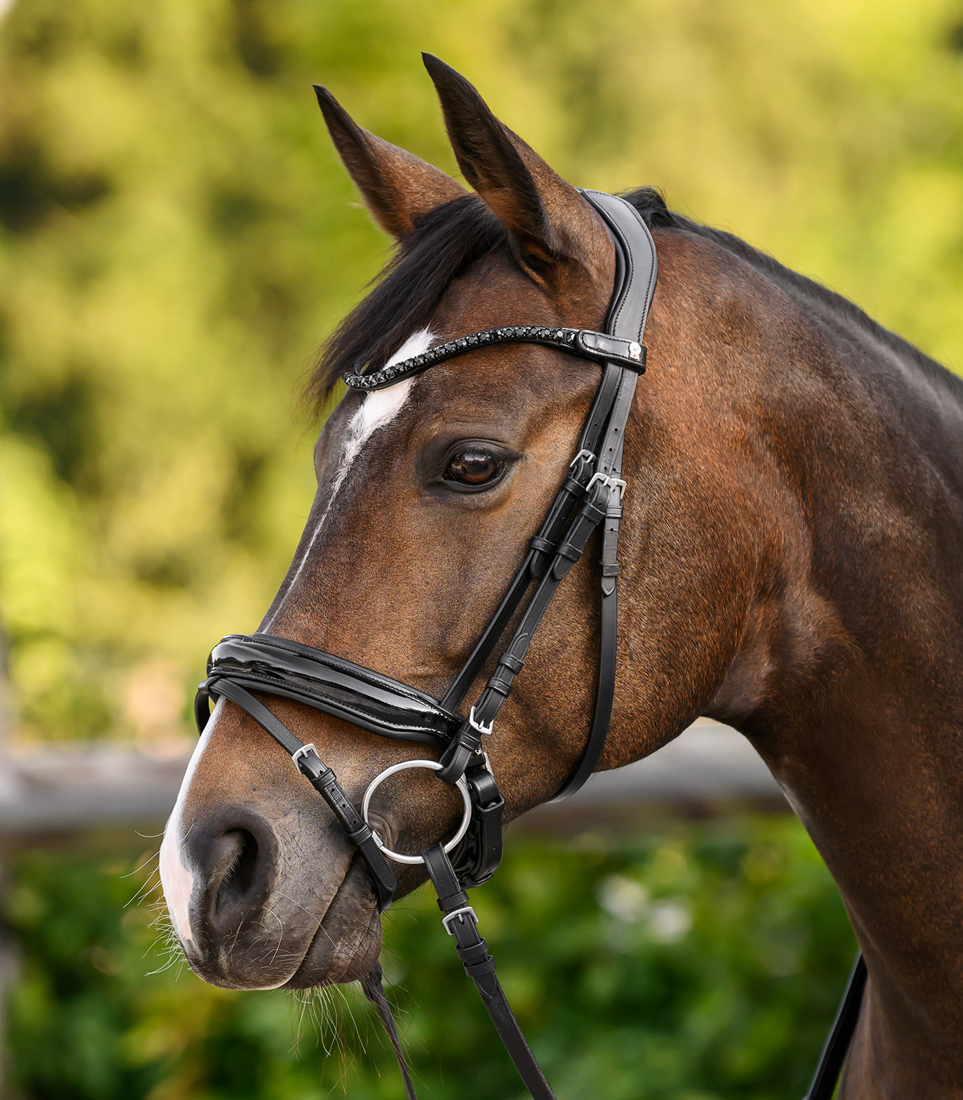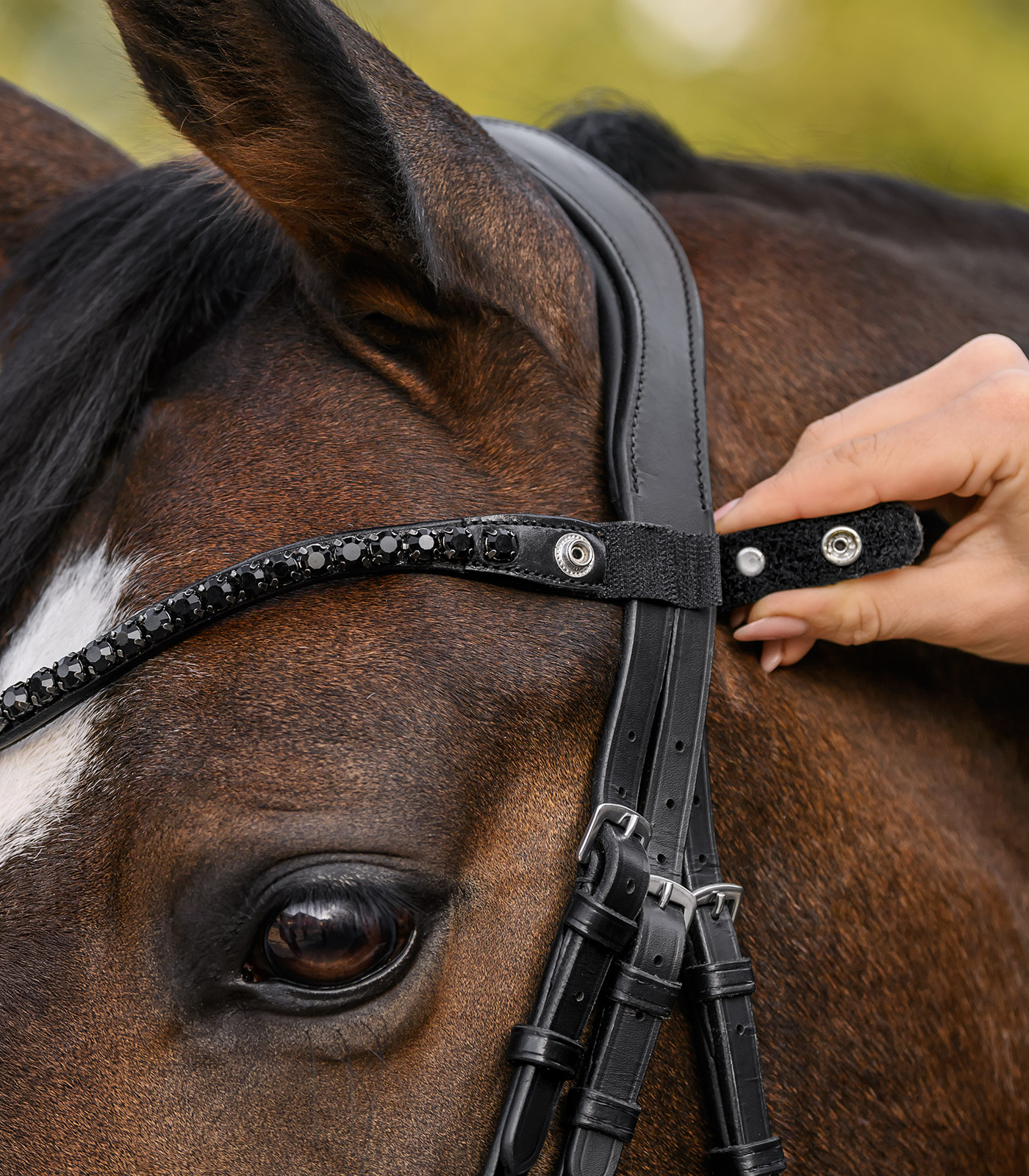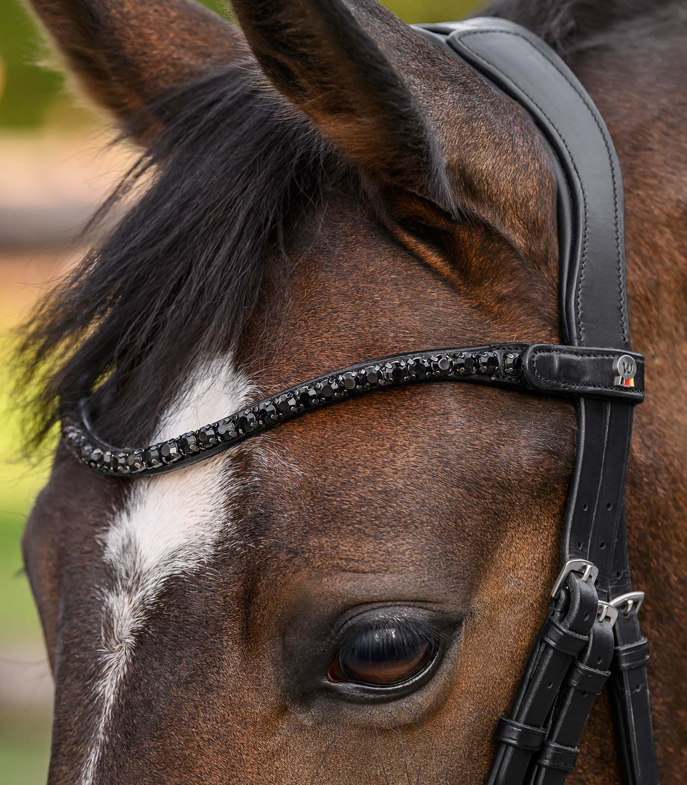 Frontal incurvé avec grosses pierres scintillantes. Grâce à un bouton-pression pratique et à une fermeture Velcro, le frontal se fixe facilement au bridon et se change tout aussi rapidement.