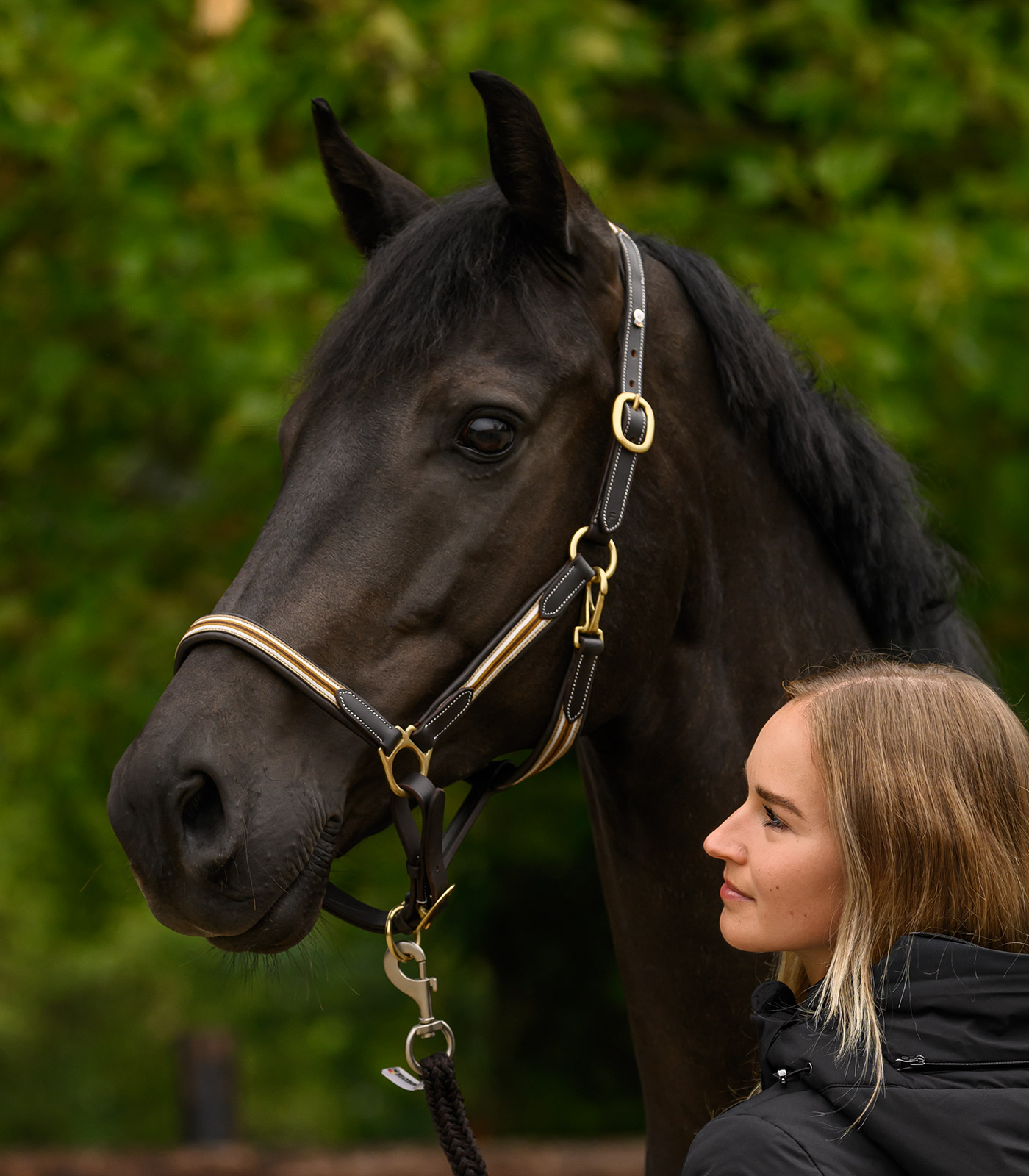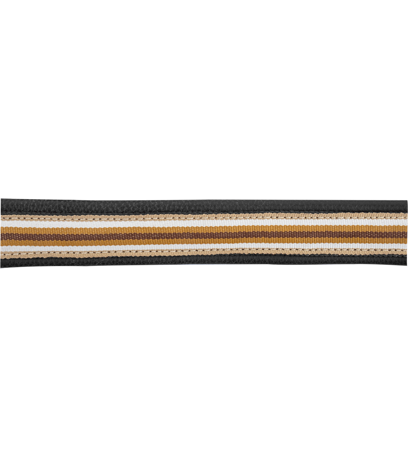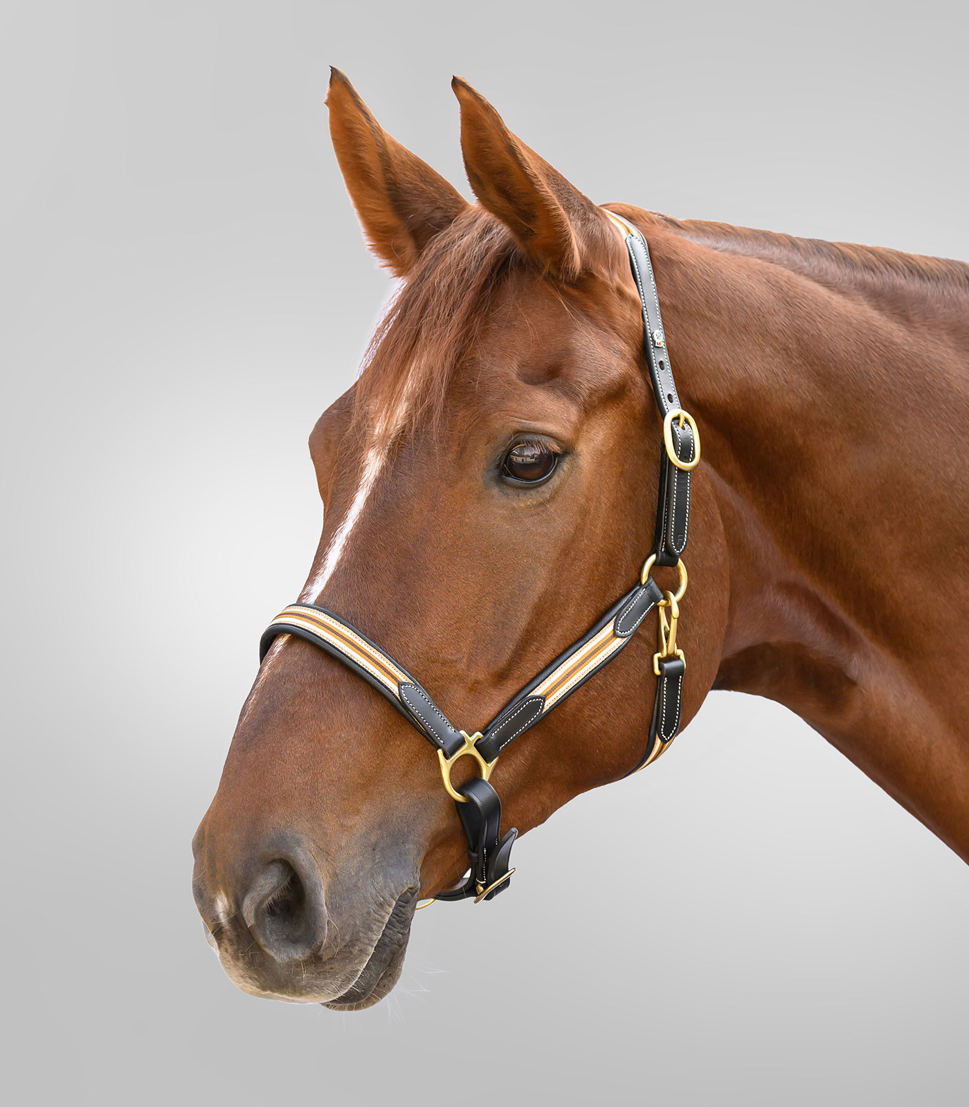 Licol en cuir doux avec surpiqûres décoratives et strap en nylon sportif cousu sur la muserolle, la sous-gorge, la têtière et les joues. Avec boucles dorées, réglables des deux côtés de la nuque.