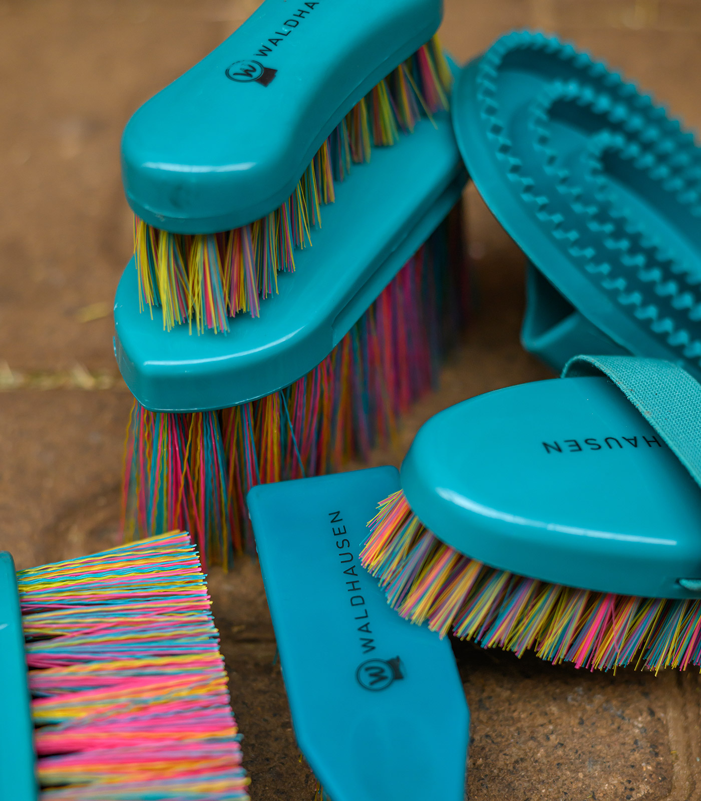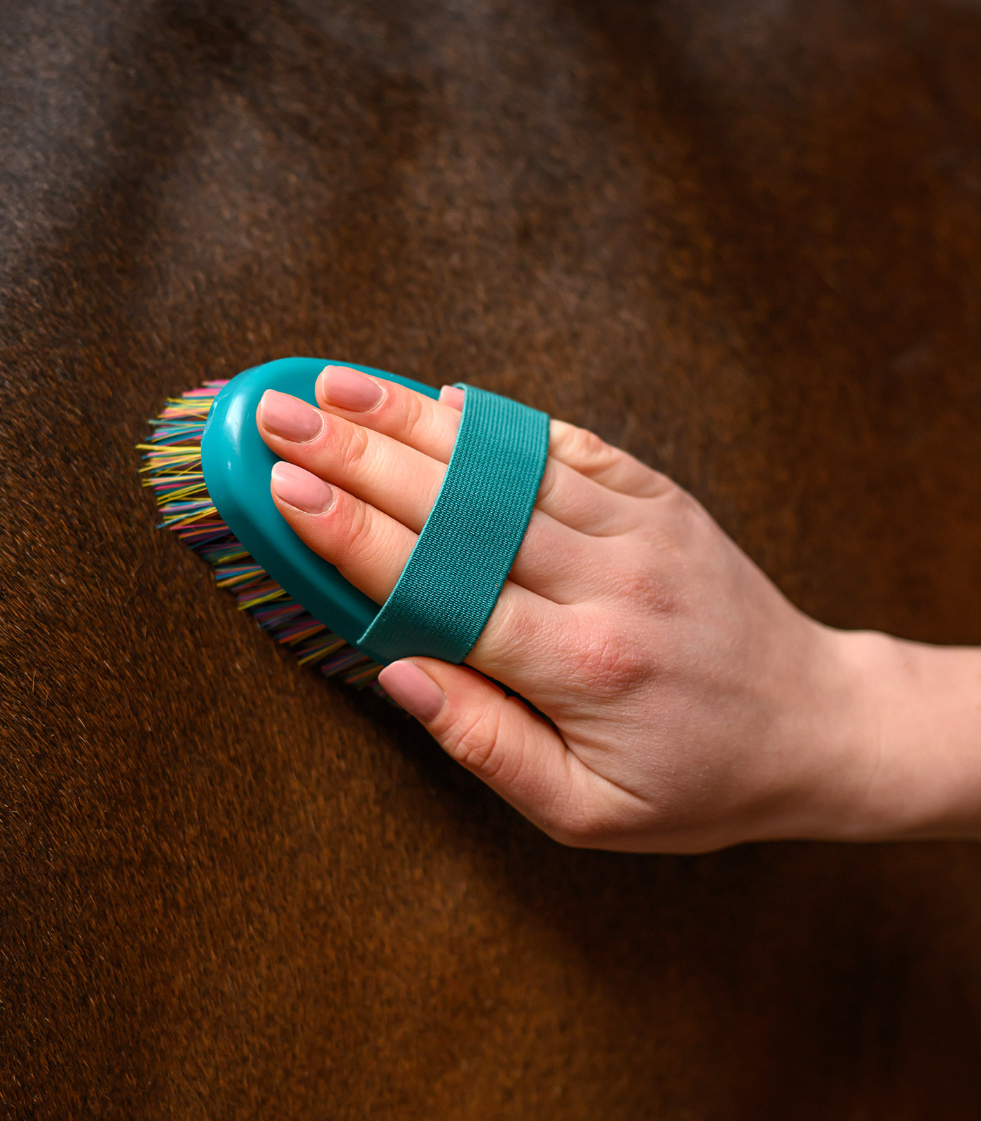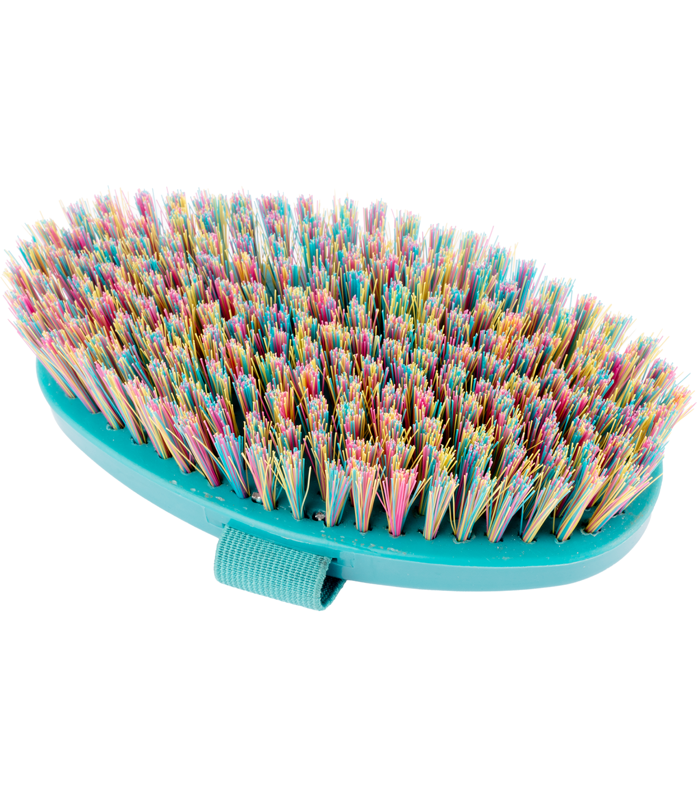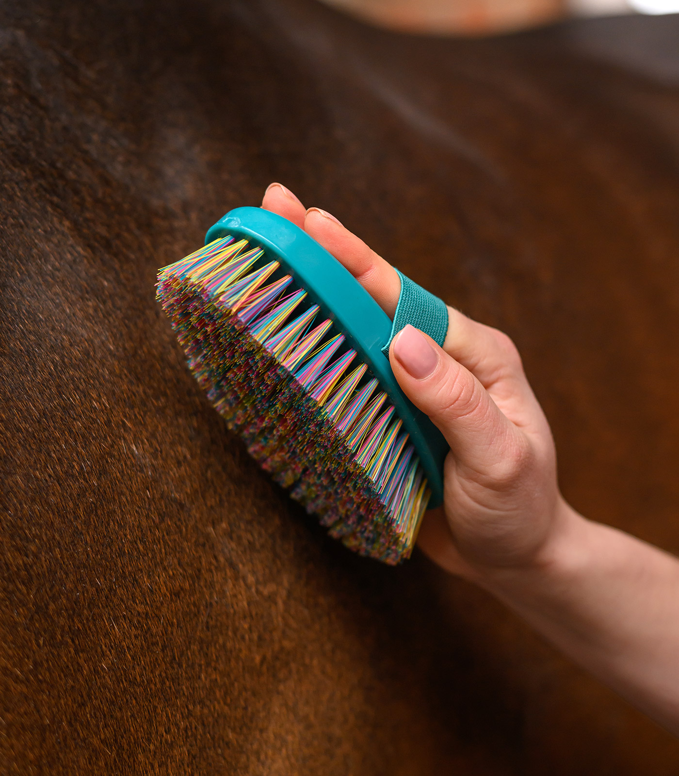 La brusca Rainbow, con le sue setole morbide e fitte, assicura una pulizia delicata e accurata del manto del cavallo. Rimuove la polvere fine e dona una lucentezza naturale. Il design colorato nei colori petrolio, rosa e giallo porta il buon umore anche nella borsa degli attrezzi.