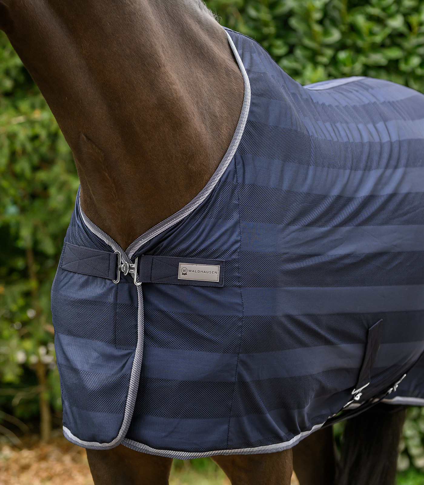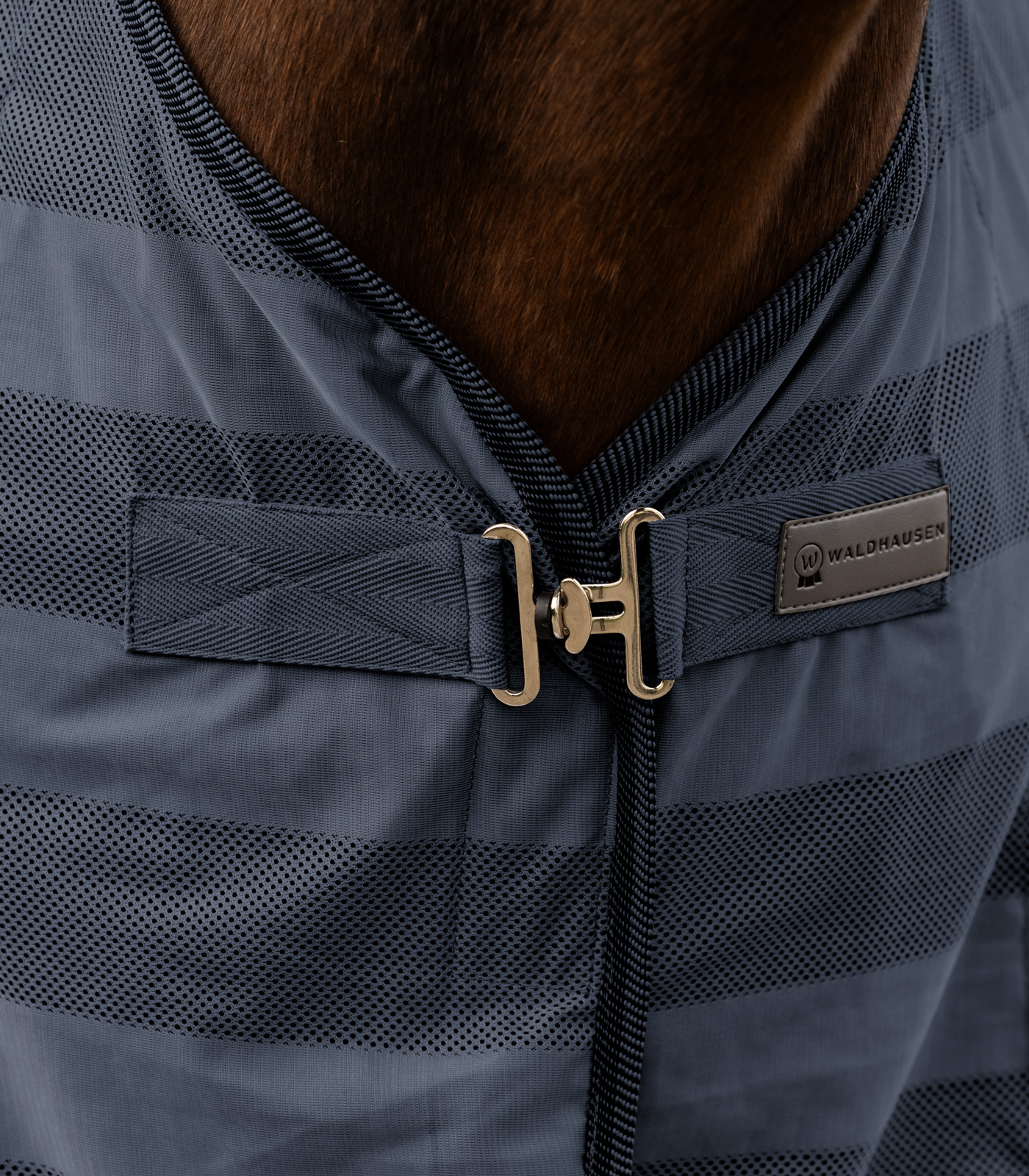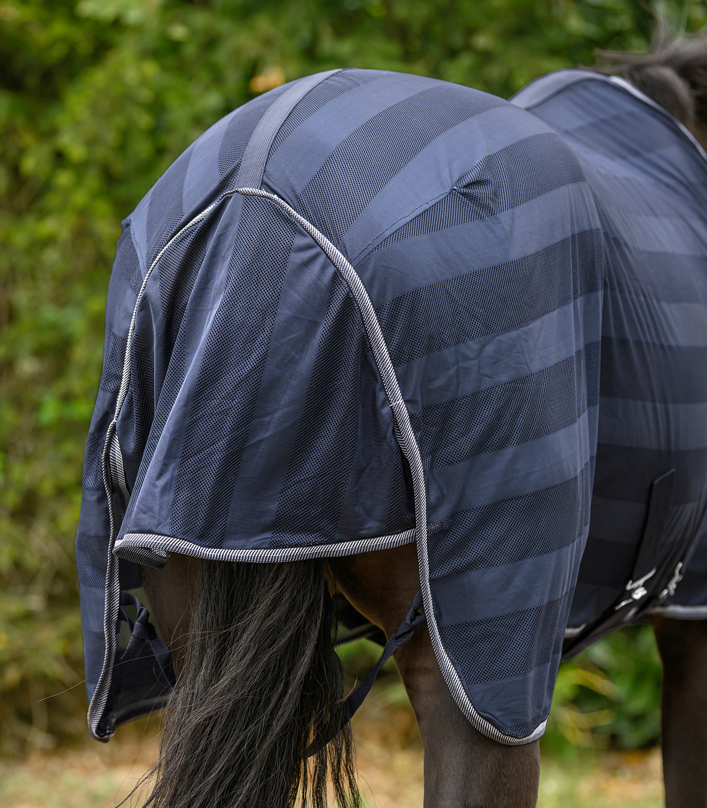 Classica coperta antimosche che protegge efficacemente da fastidiosi insetti. Ha cinghie trasversali rimovibili e regolabili che consentono di adattarla con precisione al cavallo. Ha anche una linguetta per la coda, un profondo cordino per i quarti posteriori e una chiusura a strappo sotto una pratica chiusura a T.