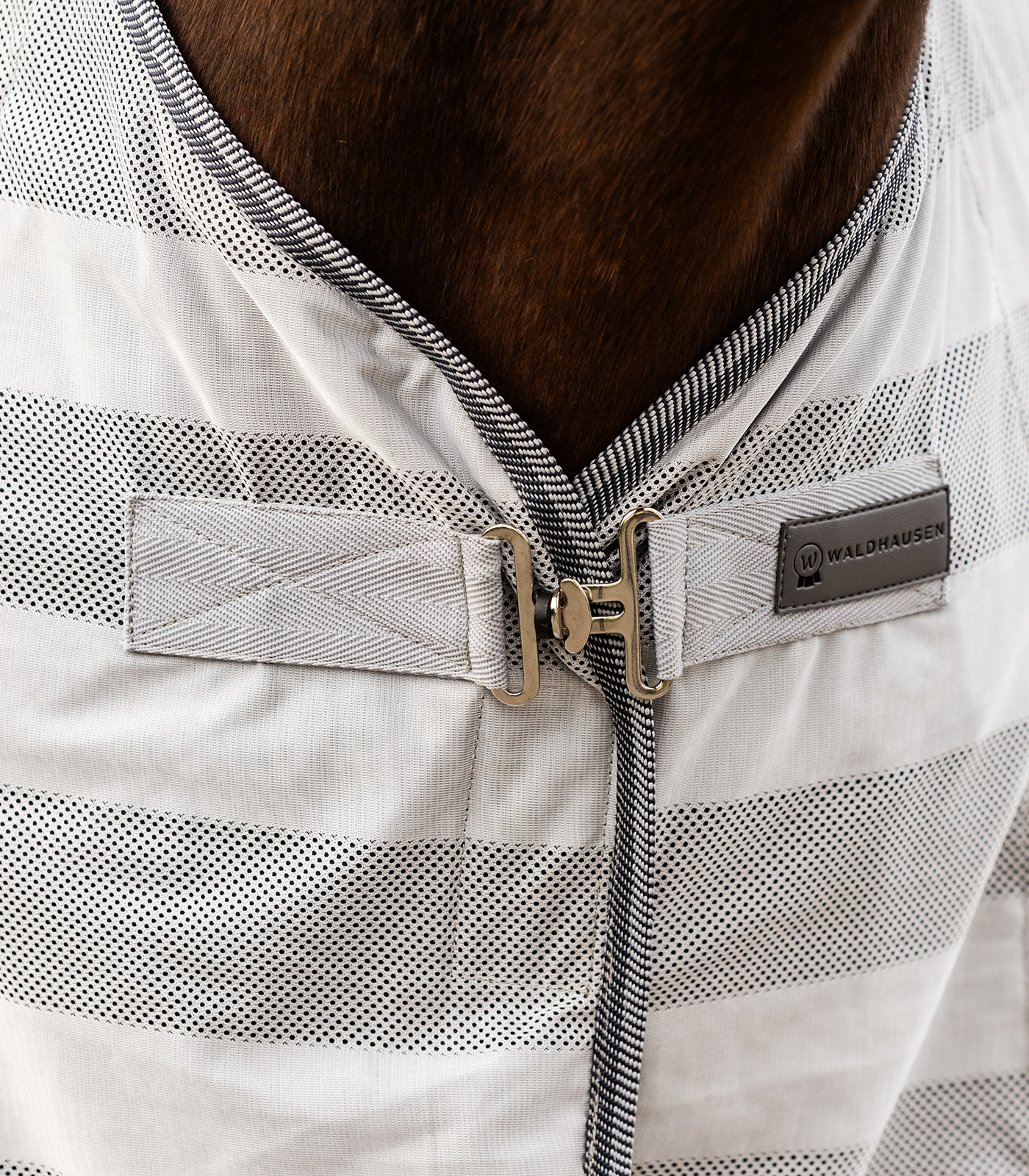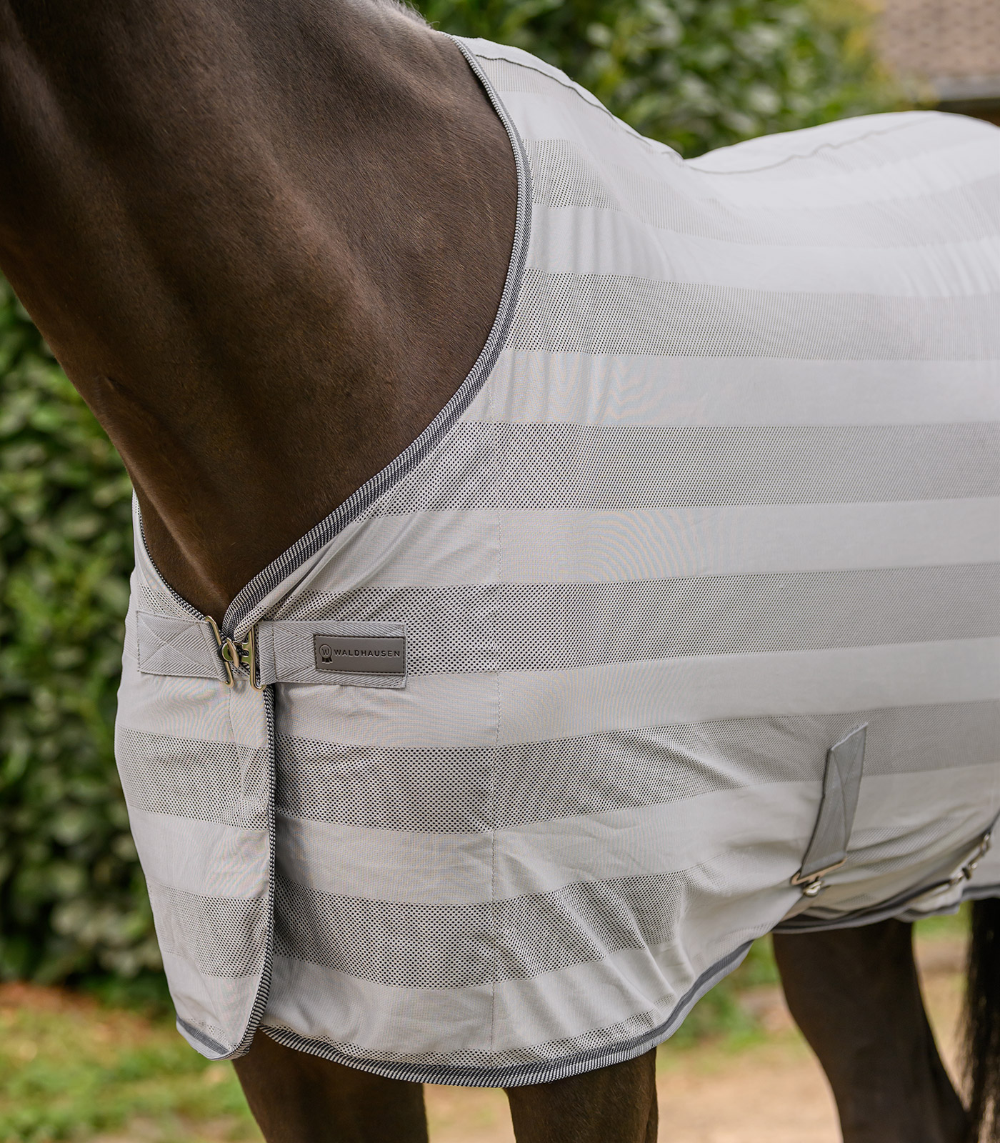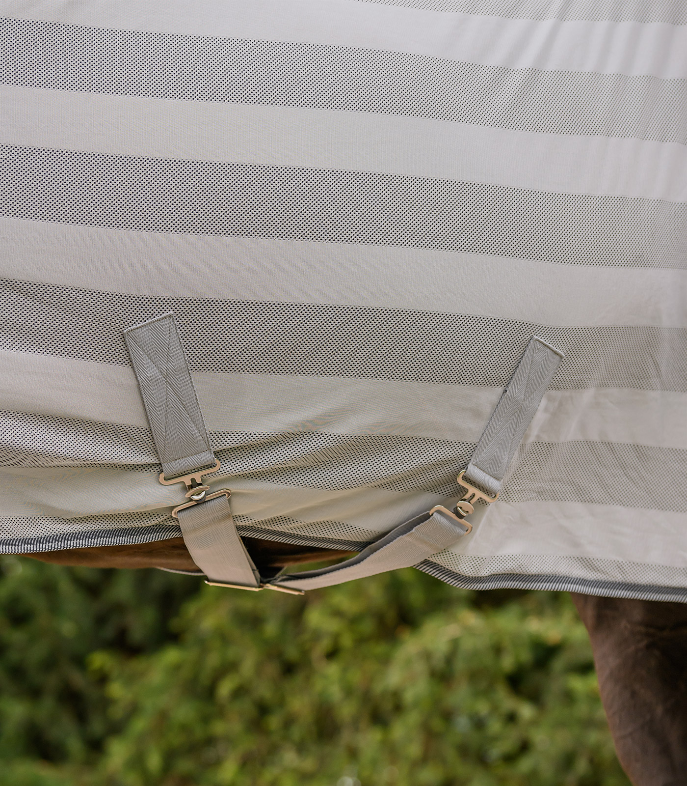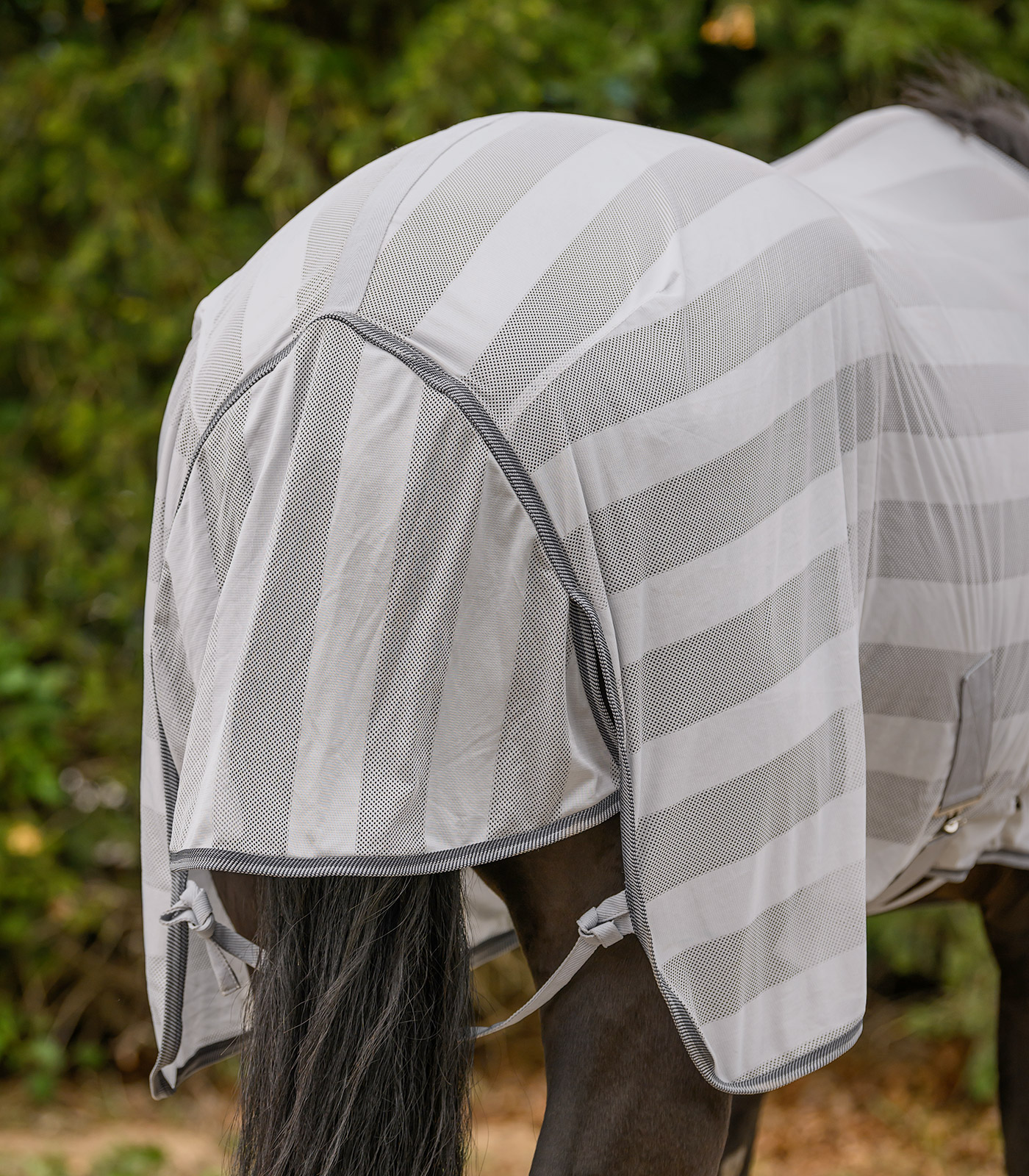 Classica coperta antimosche che protegge efficacemente da fastidiosi insetti. Ha cinghie trasversali rimovibili e regolabili che consentono di adattarla con precisione al cavallo. Ha anche una linguetta per la coda, un profondo cordino per i quarti posteriori e una chiusura a strappo sotto una pratica chiusura a T.