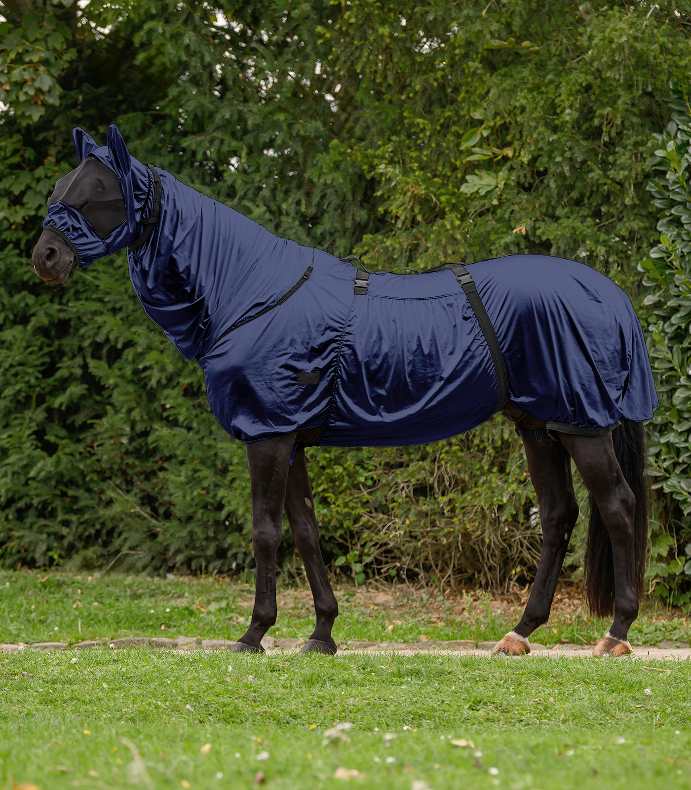 Protezione completa per cavalli con dermatite estiva, realizzata con uno speciale materiale funzionale e traspirante. Il prodotto è dotato di un collo saldamente integrato e di un ampio lembo per il ventre. Maschera non inclusa.
