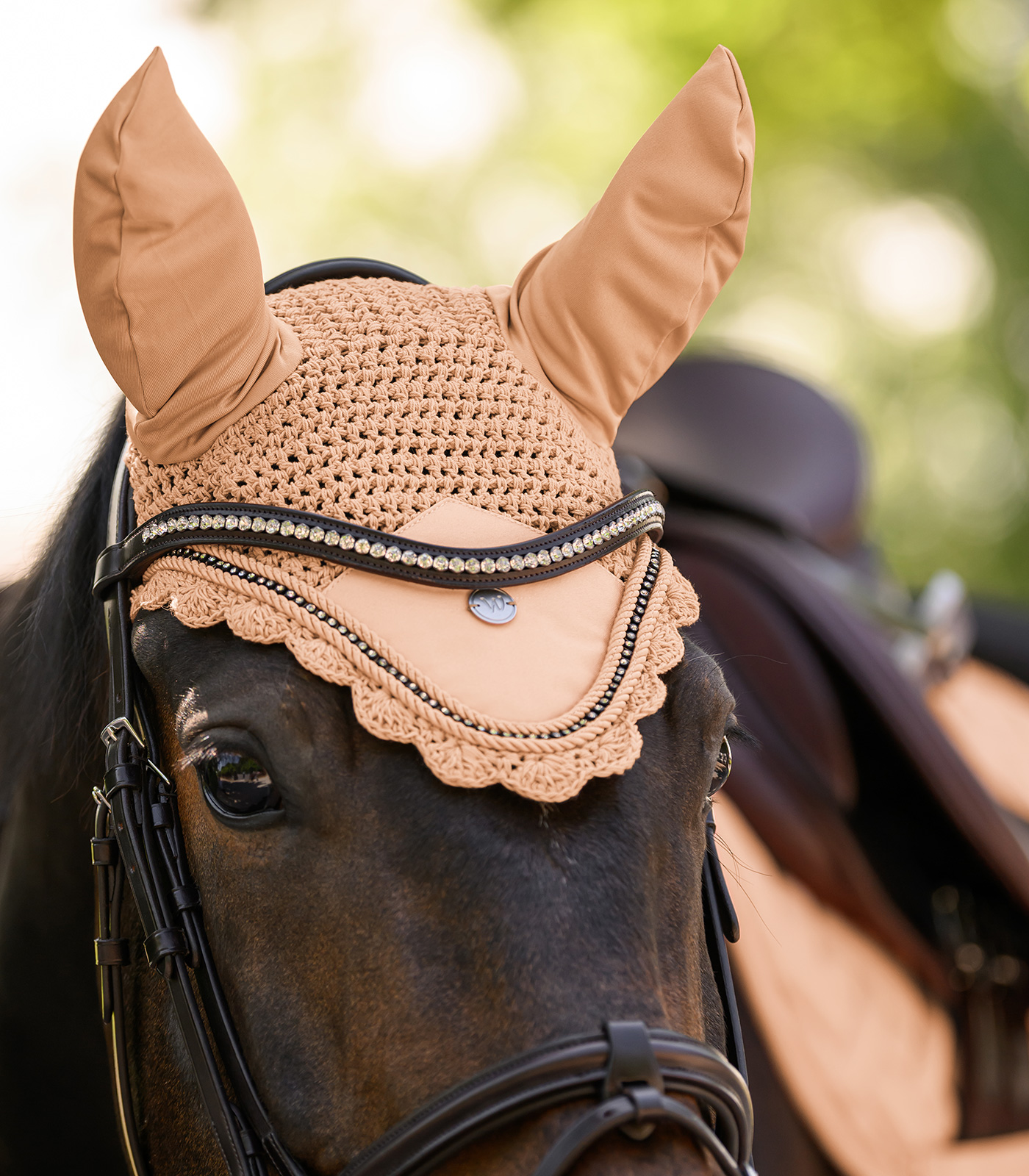 Cuffietta antimosche di alta qualità con orecchie elasticizzate della nostra collezione Turin. Una fascia di strass scintillanti tra due cordini decorativi di colore abbinato crea un look elegante. La placca in metallo argentato è centrata su un"applicazione in tessuto nel materiale lucido del cuscinetto da sella Turin, per un look armonioso nel set. La cuffietta antimosche Turin offre anche un"efficace protezione contro gli insetti fastidiosi. Il materiale elastico della sezione auricolare garantisce una perfetta aderenza alla testa del cavallo.
