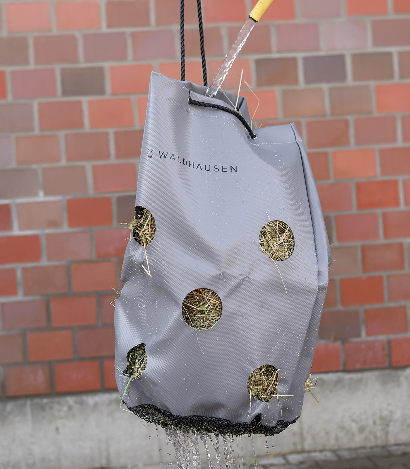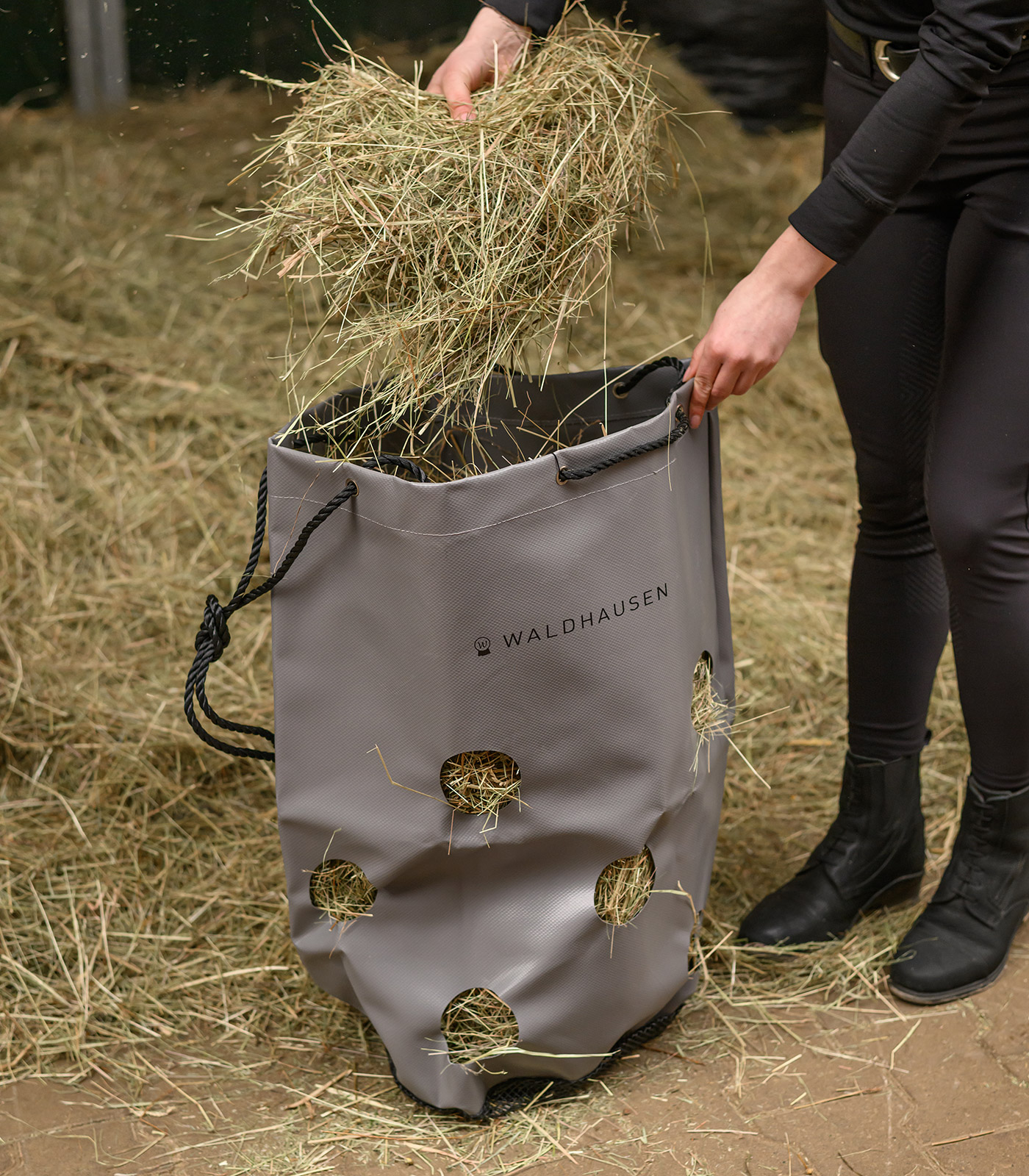 Il sacco per fieno offre una soluzione ottimale per un consumo alimentare sano e sostenibile. Con 12 fori di circa 8 cm di diametro, favorisce un’alimentazione lenta e a misura di cavallo. La superficie liscia del materiale previene le lesioni alla bocca. Il sacco per fieno Waldhausen è facile da riempire e pulire, riduce lo spreco di fieno e l’esposizione alla polvere e fa sì che la polvere e l’acqua possano cadere attraverso il fondo a rete. In questo modo il cavallo respira meno polvere di fieno. Il sacco di fieno può anche essere innaffiato, se necessario. Universalmente utilizzabile e facile da usare, il sacco per fieno combina molti vantaggi in un unico prodotto e contribuisce a un’alimentazione sana e pulita.