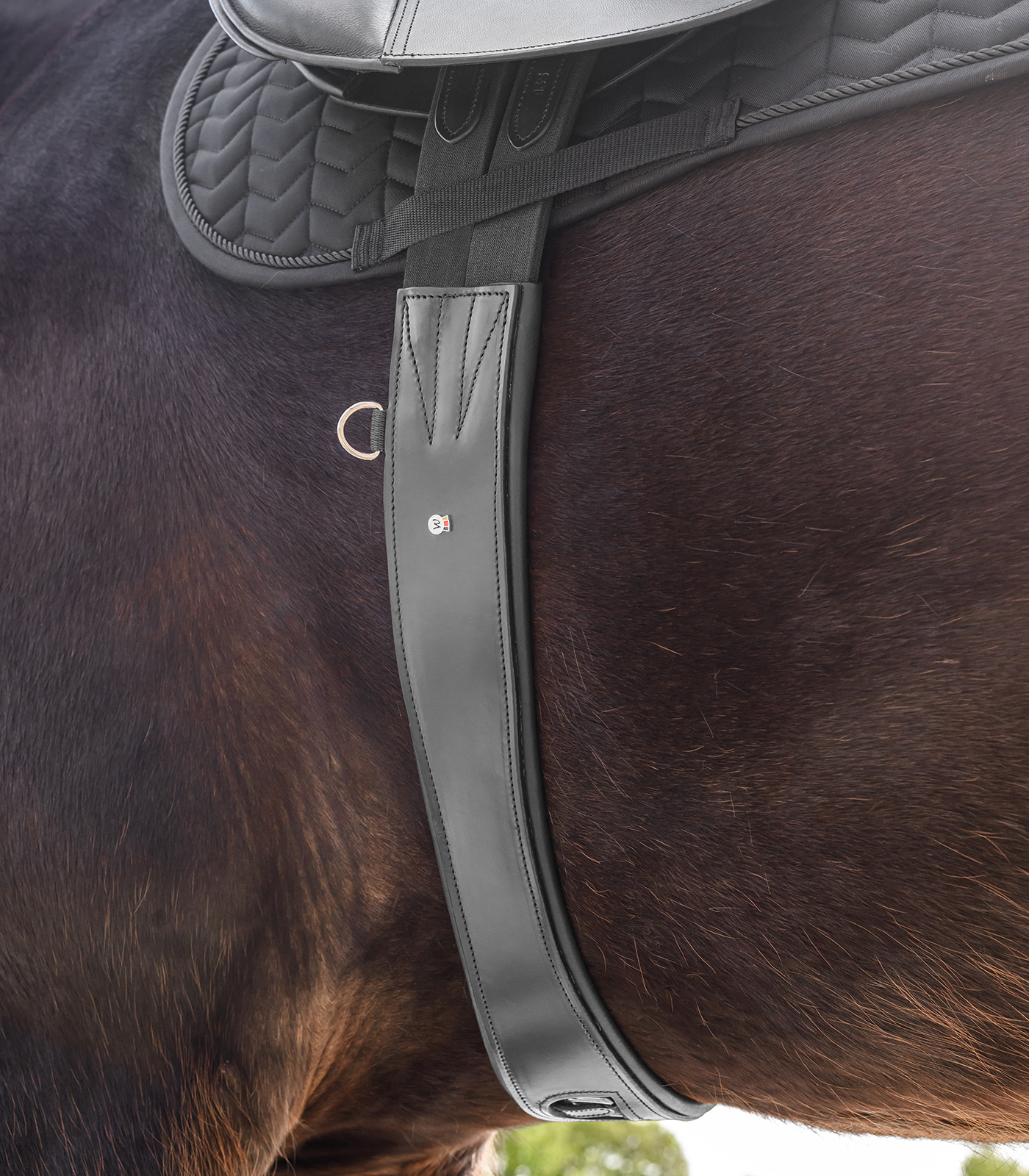 Fascione imbottito in morbido cuoio di alta qualità, con caratteristiche di indeformabilità e resistenza. Con fibbie a rullo in acciaio inox e inserto elastico su entrambe le estremità, oltre a un anello per l’attacco di redini ausiliarie.