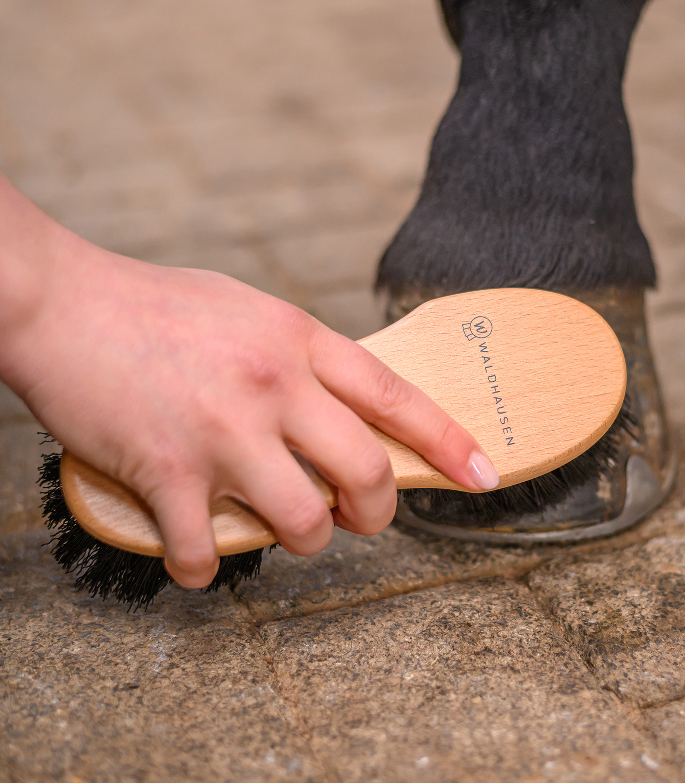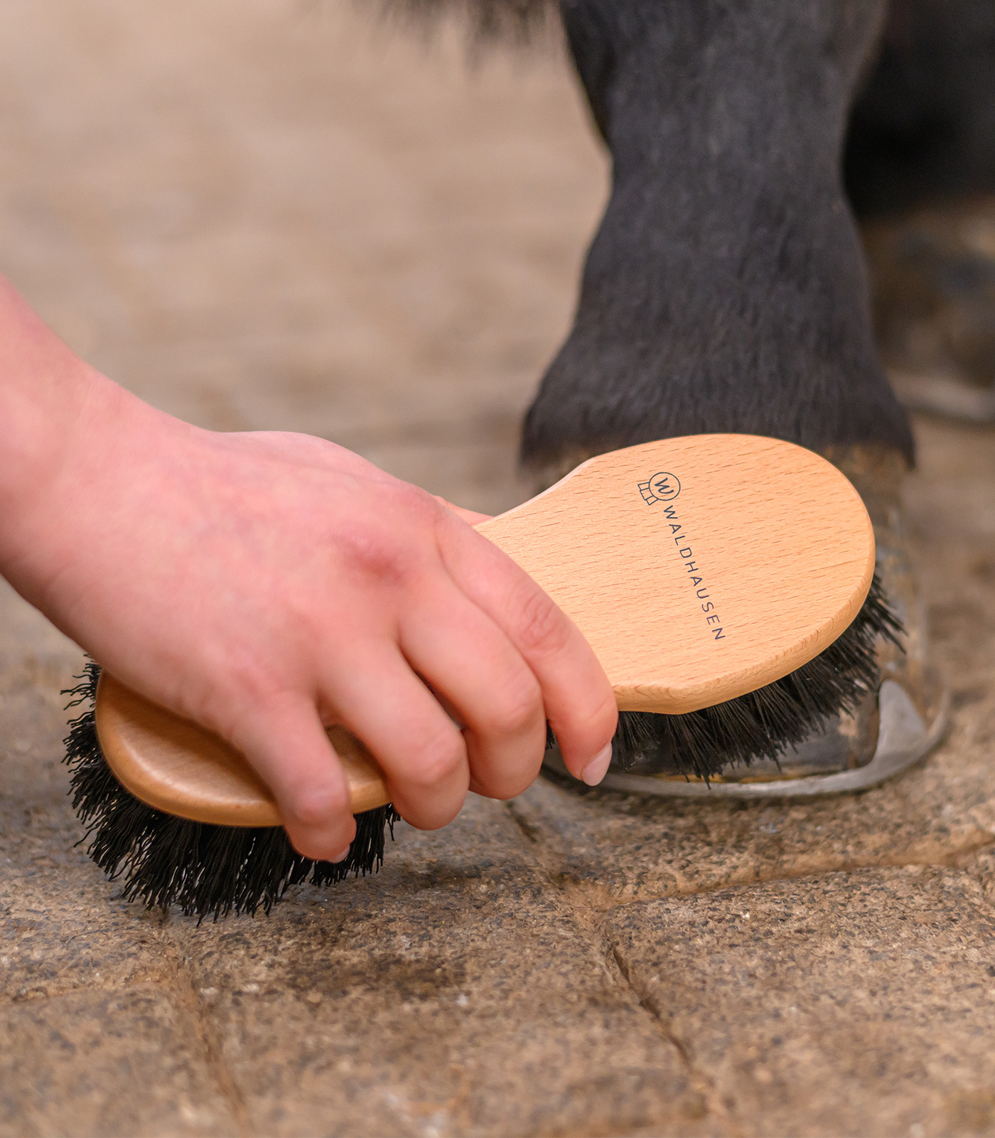 Le setole sintetiche di diversa lunghezza consentono di pulire senza fatica gli zoccoli del cavallo. La base in legno si tiene comodamente in mano.