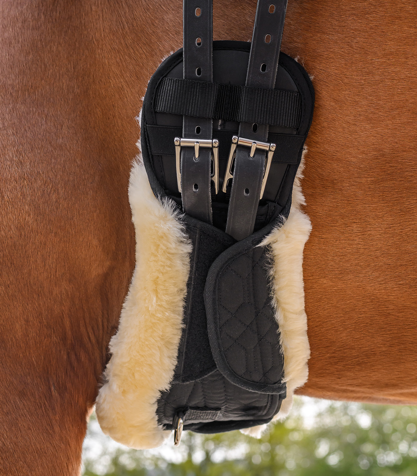 Hochwertiger anatomischer Gurt mit echtem Lammfell für optimalen Schutz vor Scheuer- und Druckstellen. Der Lammfellüberzug lässt sich dank Klettverschlüssen zum Waschen leicht entfernen. Mit D-Ringen und Edelstahl-Rollschnallen, ohne Elastik.