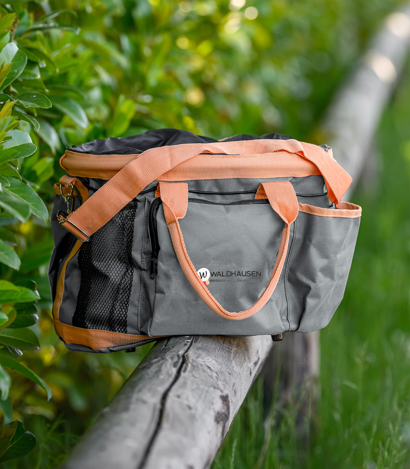 Praktische Putztasche aus reißfestem Polyester. Außen: eine Netztasche, vier offene Seitentaschen, eine Seitentasche mit Klettverschluss, eine Reißverschlusstasche mit schöner Stickerei. Innen: eine Reißverschluss-Tasche. Zwei Tragegriffe und ein abnehmbarer Schulterriemen.