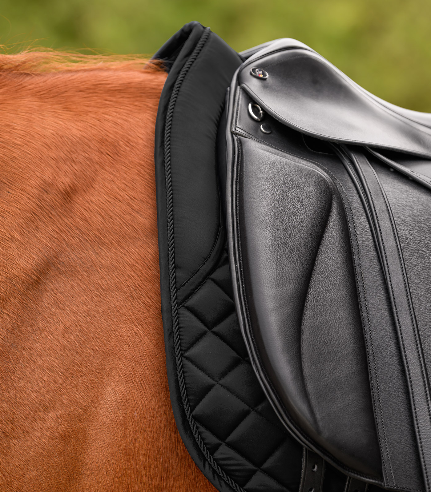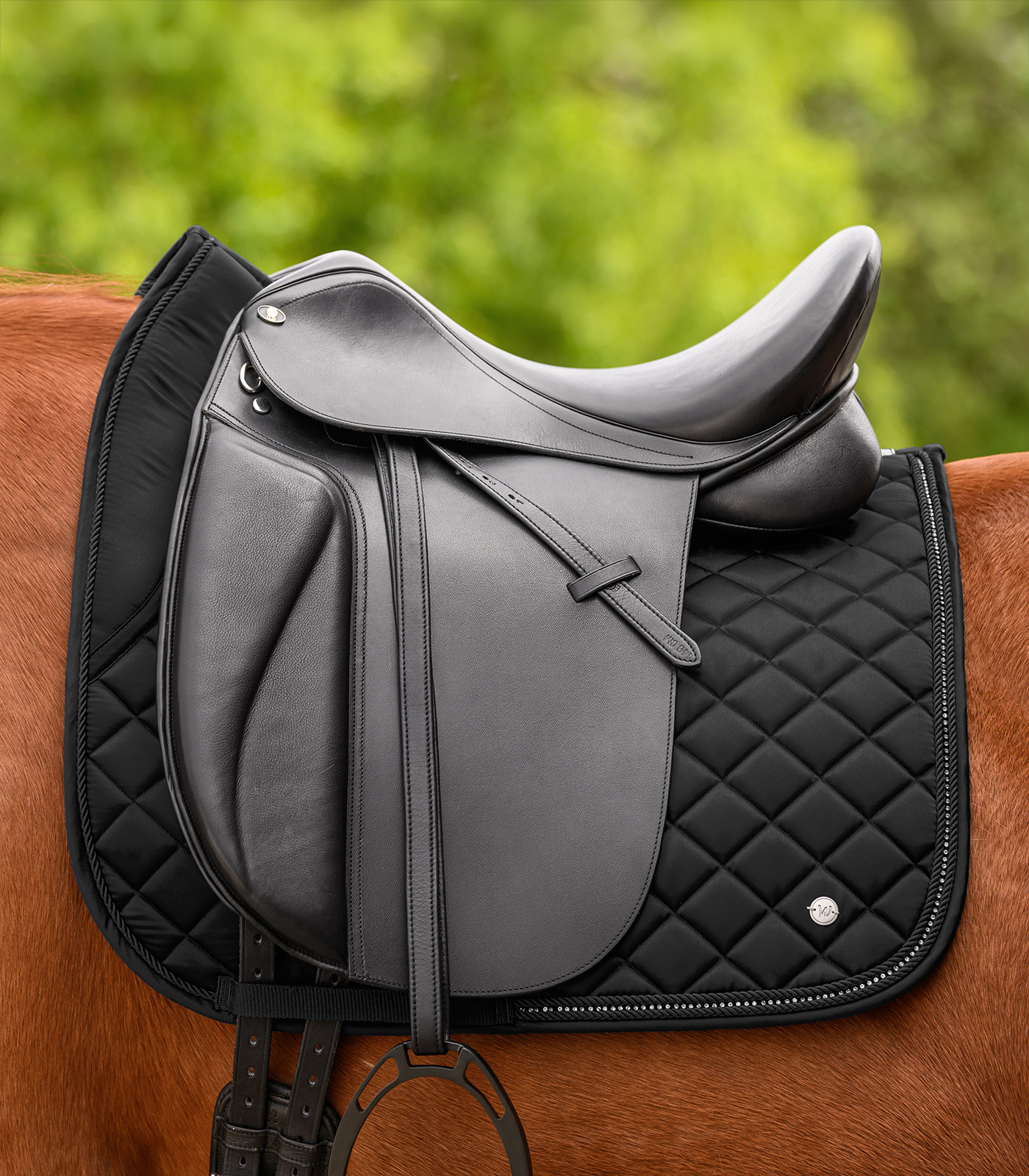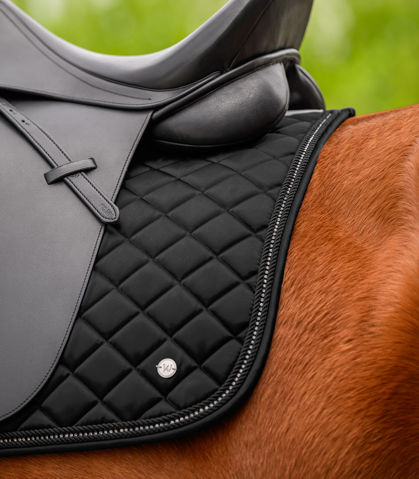 Elegante, hochwertige Schabracke im Glossy Material. Ein besonderes Detail ist das schimmernde Strassband zwischen zwei Zierkordeln. Das Logo wird in Form eines silbernen Metallplättchens dargestellt. Passend zu unser Nepal Kollektion.