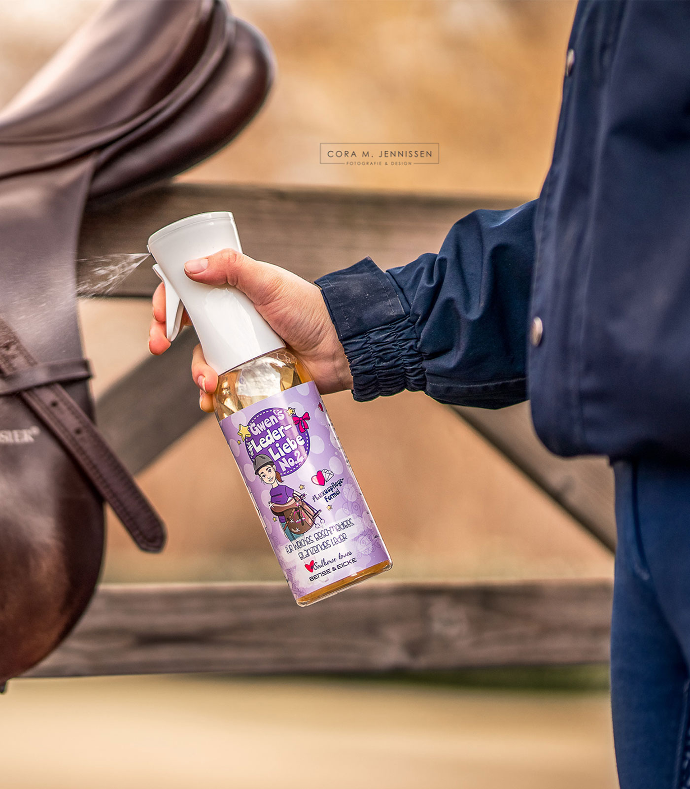 Ist Dein Lederzeug gereinigt mit #Lederliebe number one? Dann geht’s jetzt los, schau was Nummer 2 so kann. Benutzt Du es regelmäßig wird Dein Lederzeug es Dir danken, #Lederliebe No. 2 macht Dein Leder weich und weist den Dreck in die Schranken. Die Mischung aus pflanzlichem Kokosnussöl und pflegendem Glycerin, machen Dein Leder geschmeidig und haltbar und es glänzt davon so schön! Benutze es nicht für unbehandeltes oder Anilin- Velours- und Nubukleder - Teste zur Not an einer verdeckten Stelle, dann sieht‘s nicht gleich jeder! Die Anwendung ist einfach und auch für Faulpelze wie mich, einfach aufsprühen und mit einem feuchten Tuch einreiben - kann sogar ich! Nach dem Trocknen polier es kurz mit einem weichen Tuch, dann glänzt alles nochmal doppelt und Du bist startklar für den Turnierbesuch. Viel Spaß beim Putzen wünsche ich Dir nun, mit #Leberliebe No.1 & No.2 kannst Du nichts Falsches tun. Lasst uns für sauberes Sattelzeug im Stall plädieren, mit #Lederliebe wird der Schmutz hier ab sofort nicht mehr regieren!