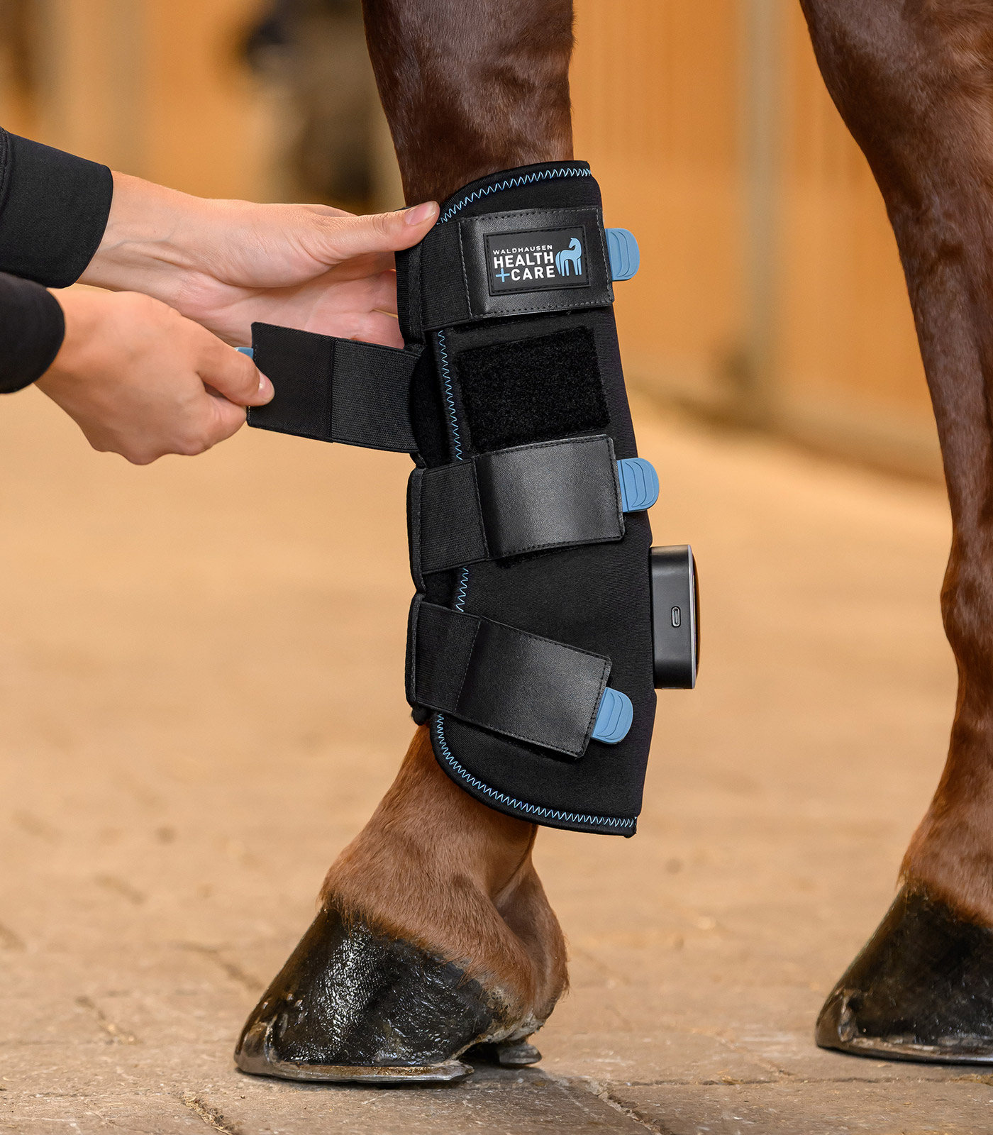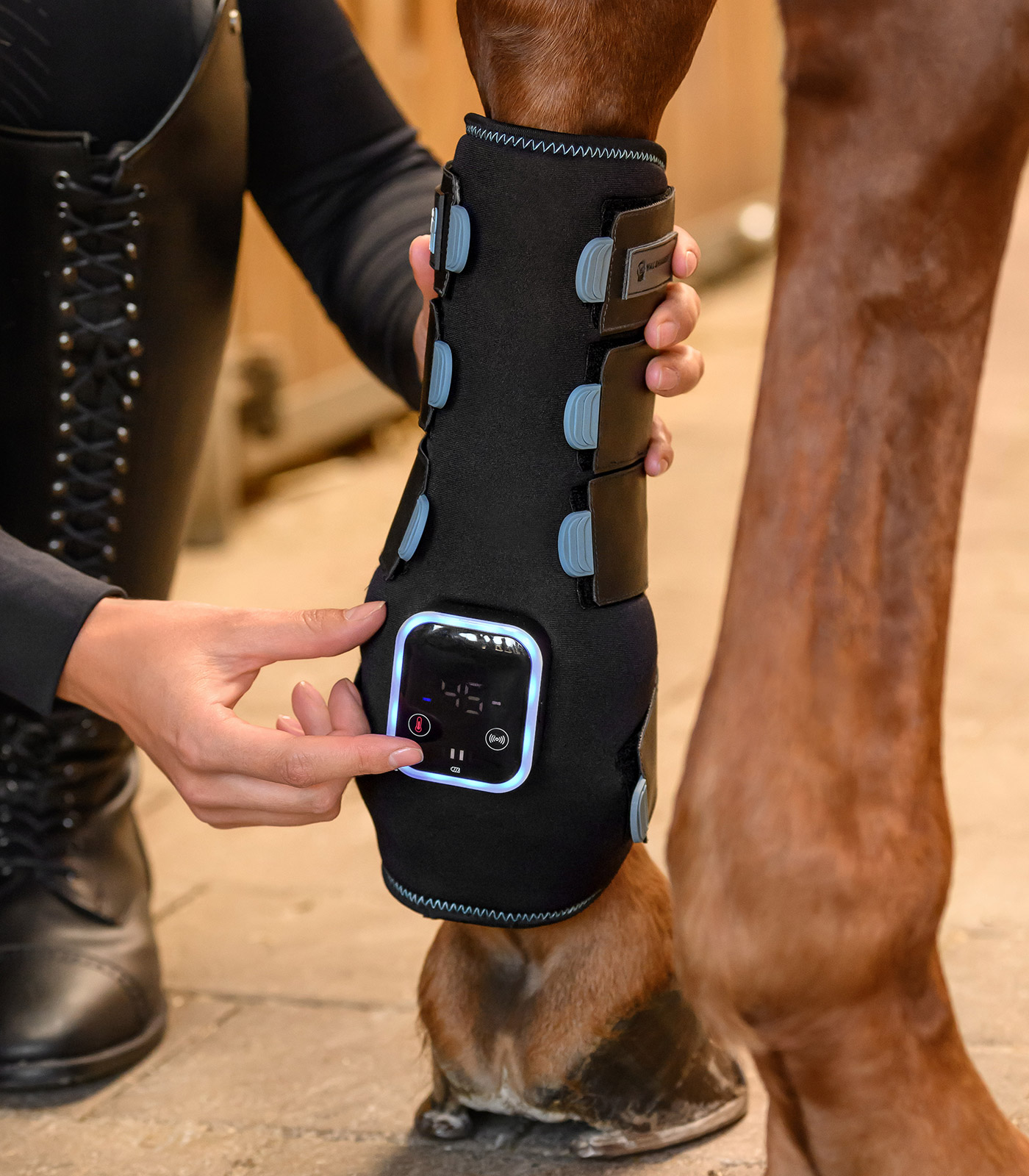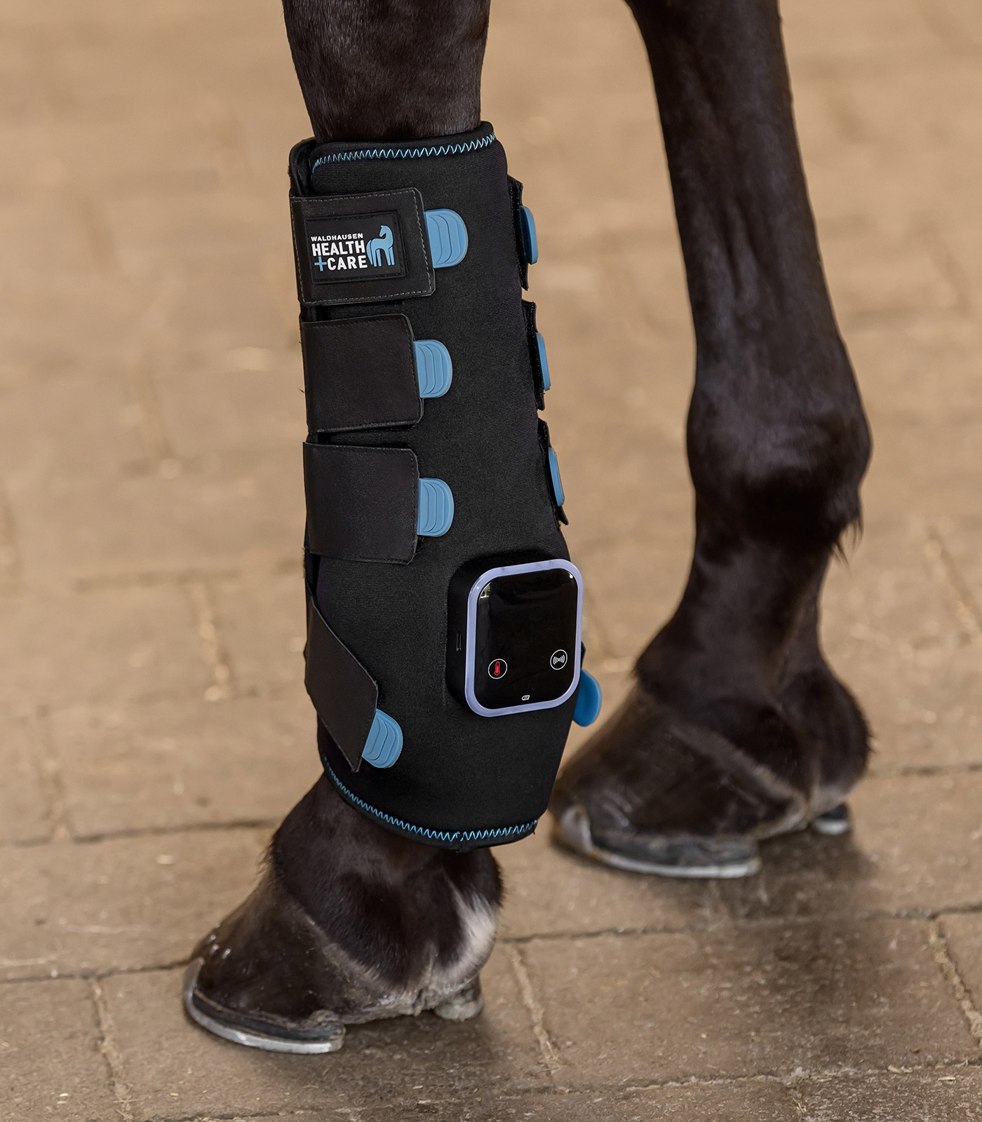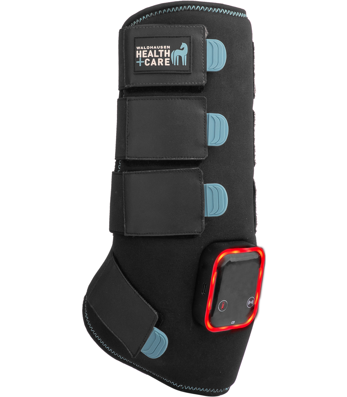 Ob bei Verletzungen, zur Vorbereitung auf Belastung oder zur Regeneration nach dem Training - die neue, technisch weiterentwickelte TecSupreme Gamasche von Waldhausen Health + Care unterstützt das Pferdebein effektiv durch drei gezielte Funktionen: Vibration, Kühlung und Wärme. Alle Funktionen sind einzeln steuerbar. Dank des fest in die Gamasche integrierten Akkus ist kein separates Batteriefach mehr nötig - für mehr Komfort und Zuverlässigkeit im Stallalltag. Die intuitive Steuerung über einen Touchscreen ermöglicht eine einfache Bedienung direkt an der Gamasche. Eine farbliche LED-Anzeige informiert jederzeit klar erkennbar über den aktuell gewählten Modus. Bei Sehnenschäden kann die Waldhausen Health + Care TecSupreme Gamasche die Neuausrichtung der Sehnenfasern in der Heilungsphase unterstützen. Die flexibel einsetzbare Kühlfunktion der Gamasche wirkt entzündungshemmend und schmerzlindernd. Wird die Vibrationsfunktion aktiviert, kann die TecSupreme Gamasche Schwellungen minimieren und aktiviert die Blutzirkulation im Bein. Auch im Winter bei längeren Ruhephasen in der Box ist die Gamasche optimal zum Aufwärmen und der Anregung der Durchblutung im Pferdebein. Dieses macht die Sehnen elastischer und kann das Verletzungsrisiko verringern. Die Wärme- und Vibrationsfunktionen sind jeweils in drei Intensitätsstufen einstellbar, um individuell auf die Bedürfnisse Ihres Pferdes eingehen zu können. Beidseitig schließbare Klettverschlüsse - für optimale Anpassung und hohen Tragekomfort am linken oder rechen Bein. Die Gamasche wird in einer hochwertigen, isolierenden Kühltasche geliefert, die die Kühlpacks auch unterwegs angenehm kühl hält. Bei gleichzeitiger Nutzung von Wärme- und Vibrationsfunktion beträgt die Laufzeit ca. 90 Minuten. Bitte beachten Sie: Die Akkuleistung kann bei extremen Temperaturen variieren. Stück