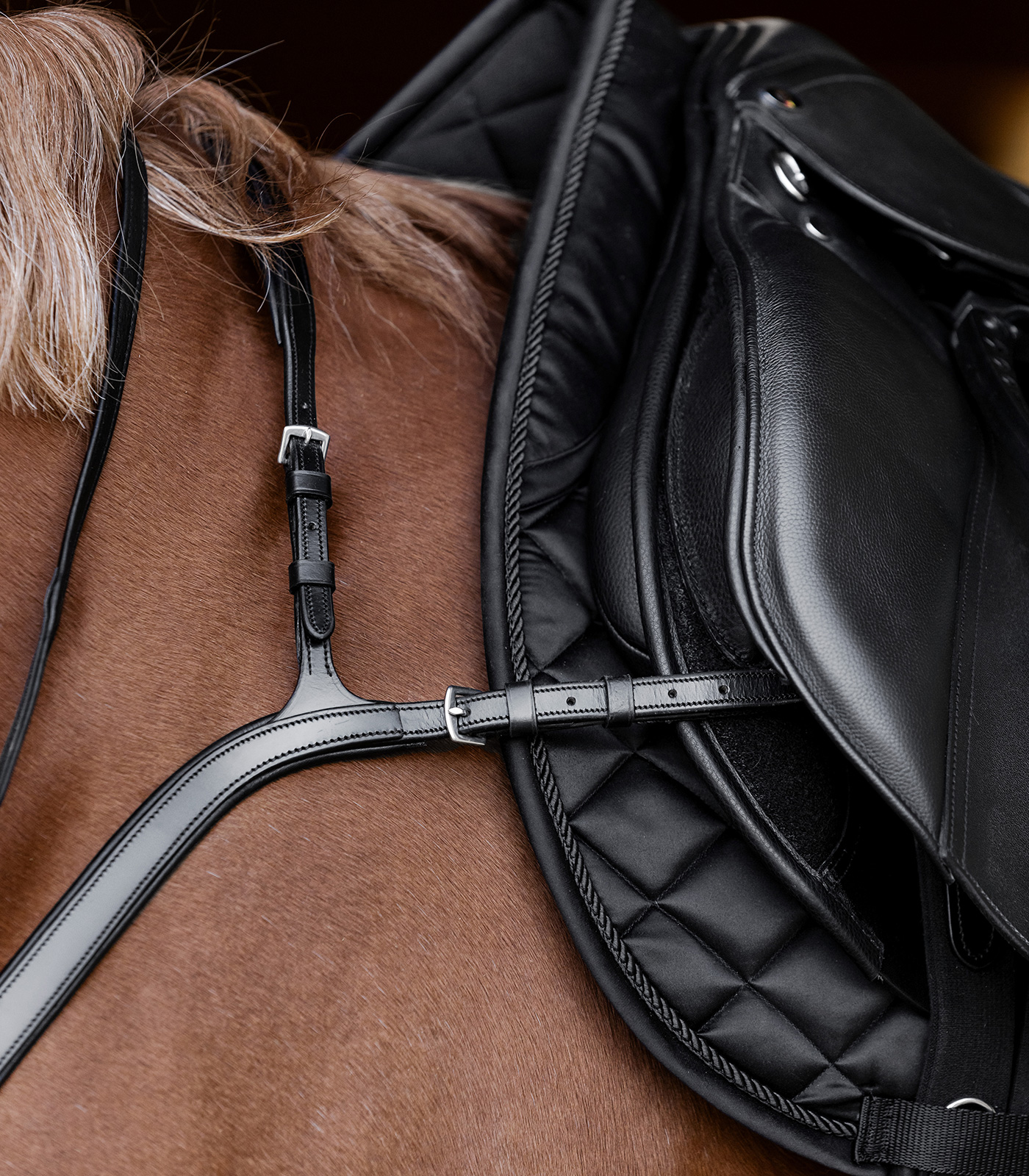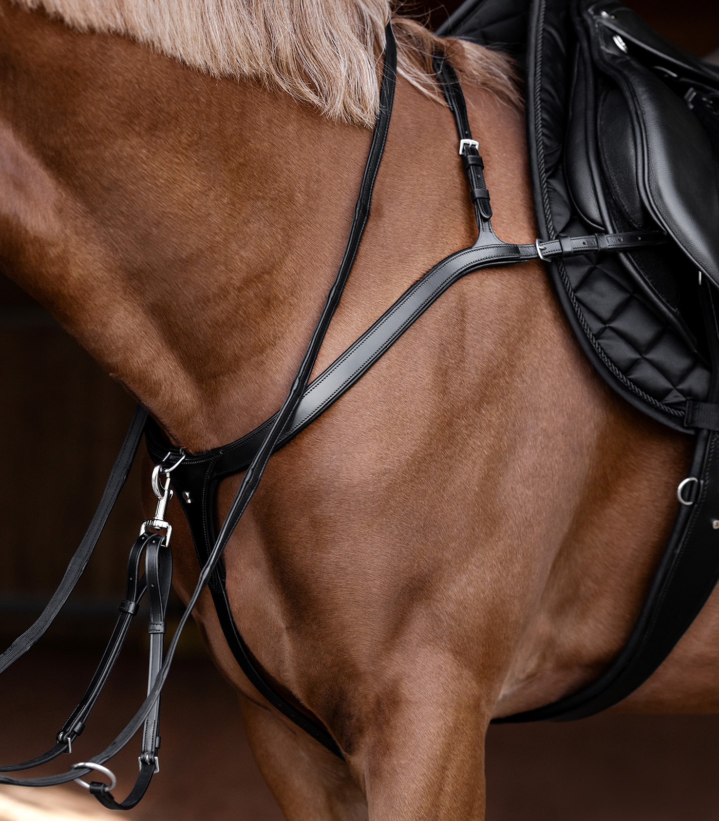 Hochwertiges Vorderzeug mit anatomischem Schnitt – optimale Stabilität und Bewegungsfreiheit. Das Waldhausen X-Line Vorderzeug mit langer Brücke und tiefem 3-Punkt verhindert ein Verrutschen des Sattels, ohne das Pferd zu stören. Der anatomische Schnitt ermöglicht eine uneingeschränkte Bewegungsfreiheit der Schulter und bietet gleichzeitig einen optimalen Halt des Sattels. Die Befestigung erfolgt an drei Punkten: Am Sattelgurt mit einem verstellbaren Lederriemen sowie an den Gurtstrupfen. Das Vorderzeug kombiniert Stabilität und Komfort für das Pferd und unterstützt eine optimale Leistungsfähigkeit während des Trainings.
